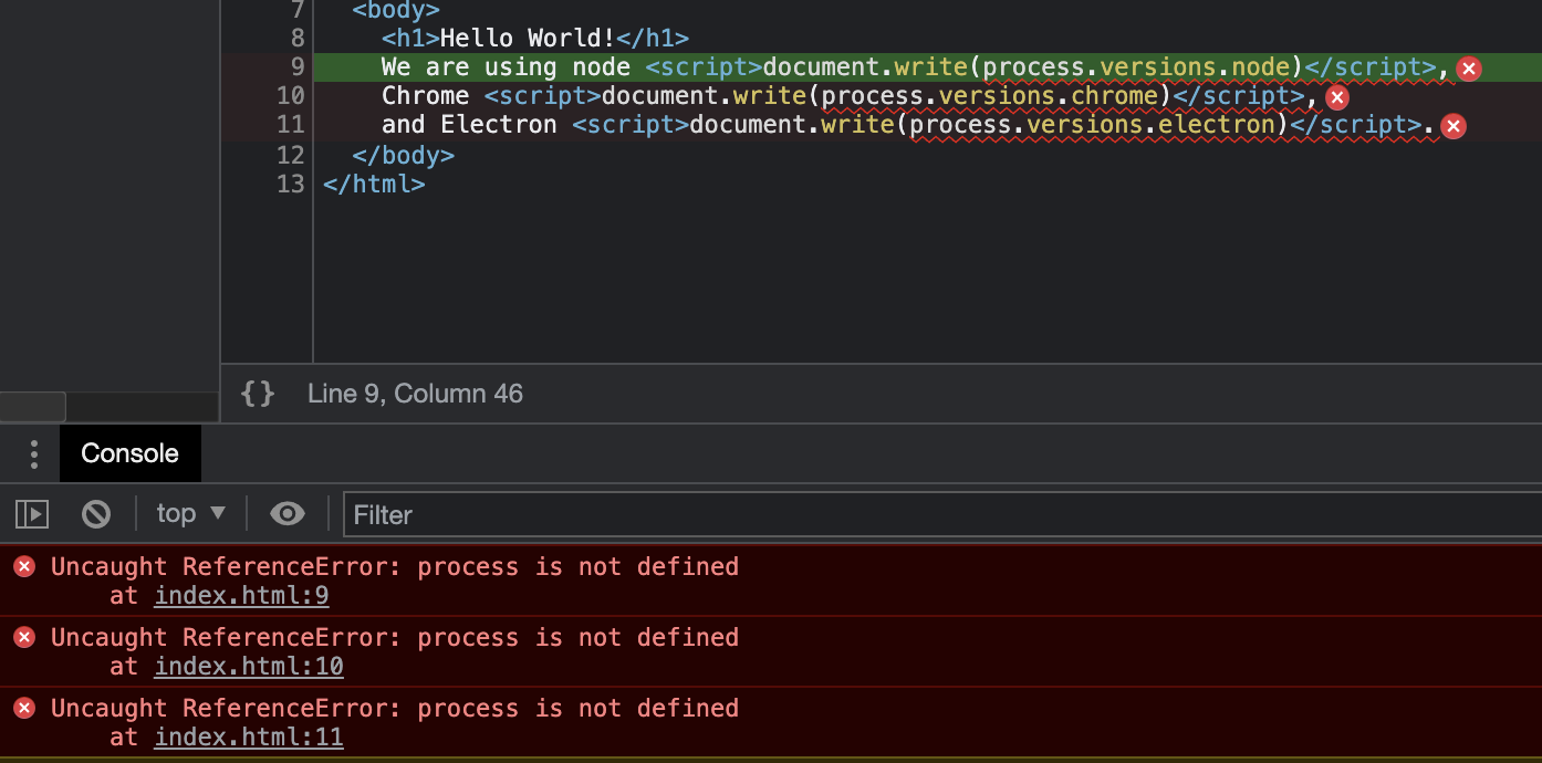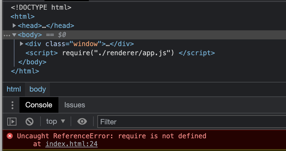하지만 Electron 12부터는 컨텍스트 격리가 기본으로 동작하게 되므로 해당 부분은 에러가 발생하게 된다.