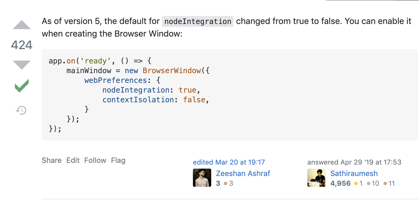 일단 찾아보니 Electron 12 부터 Context Isolation 이라는 것이 활성화 되었고 Renderer Process 에서 수행할 수 있는 것들이 제한이 생겼다. stackoverflow 의 top 댓글은 회피하는 방법에 대해 알려주고 있다. 사실 이 방법이 가장 빠르고 편하게 할 수 있는 방법 때문이었을 것이다.