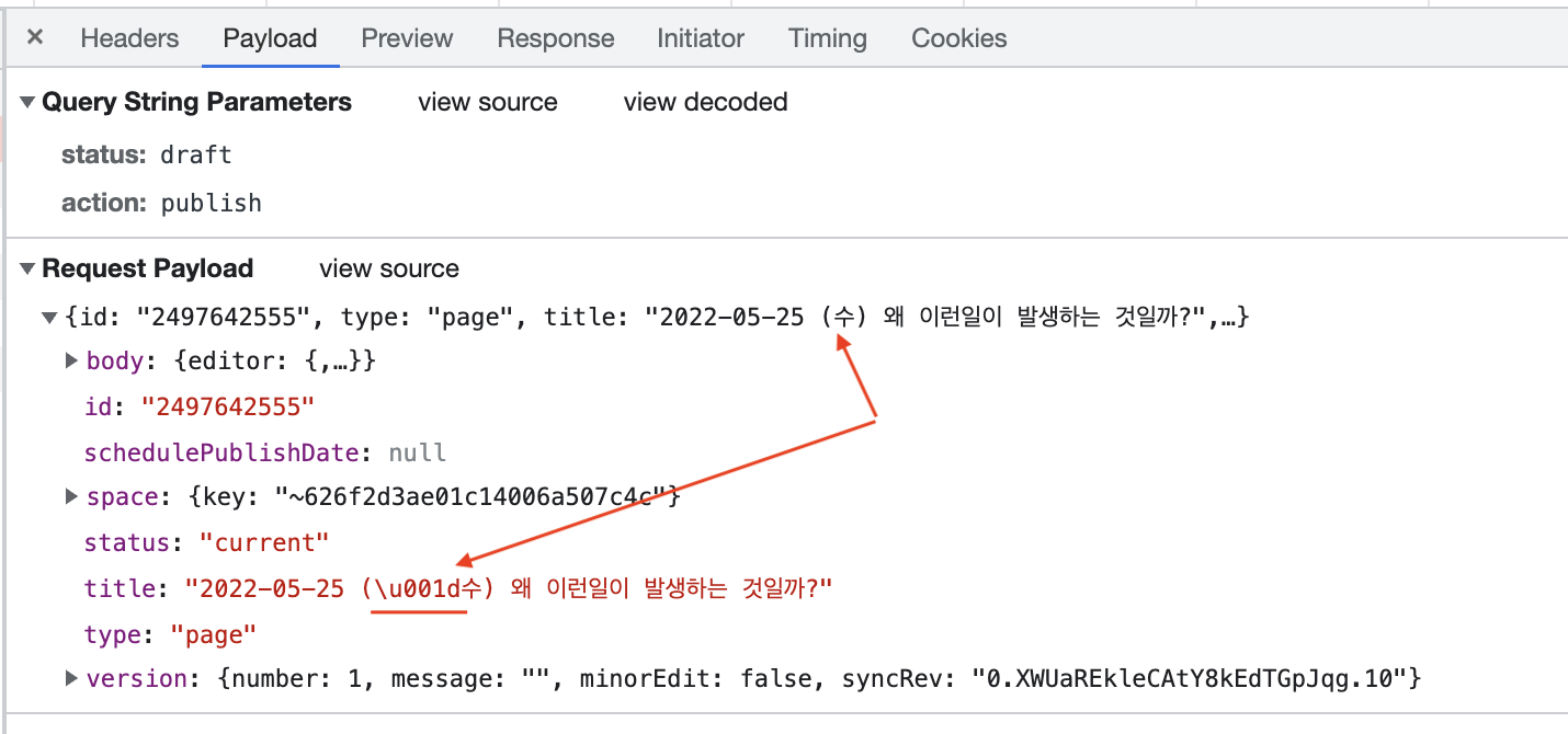 JSON 전체(source)가 있는 윗부분에는 (수) 부분이 그냥 보이지만, title 필드에서 보면 유니코드 \u001d 라고 보여서 어떤 문자가 있다는 것을 알 수 있다.