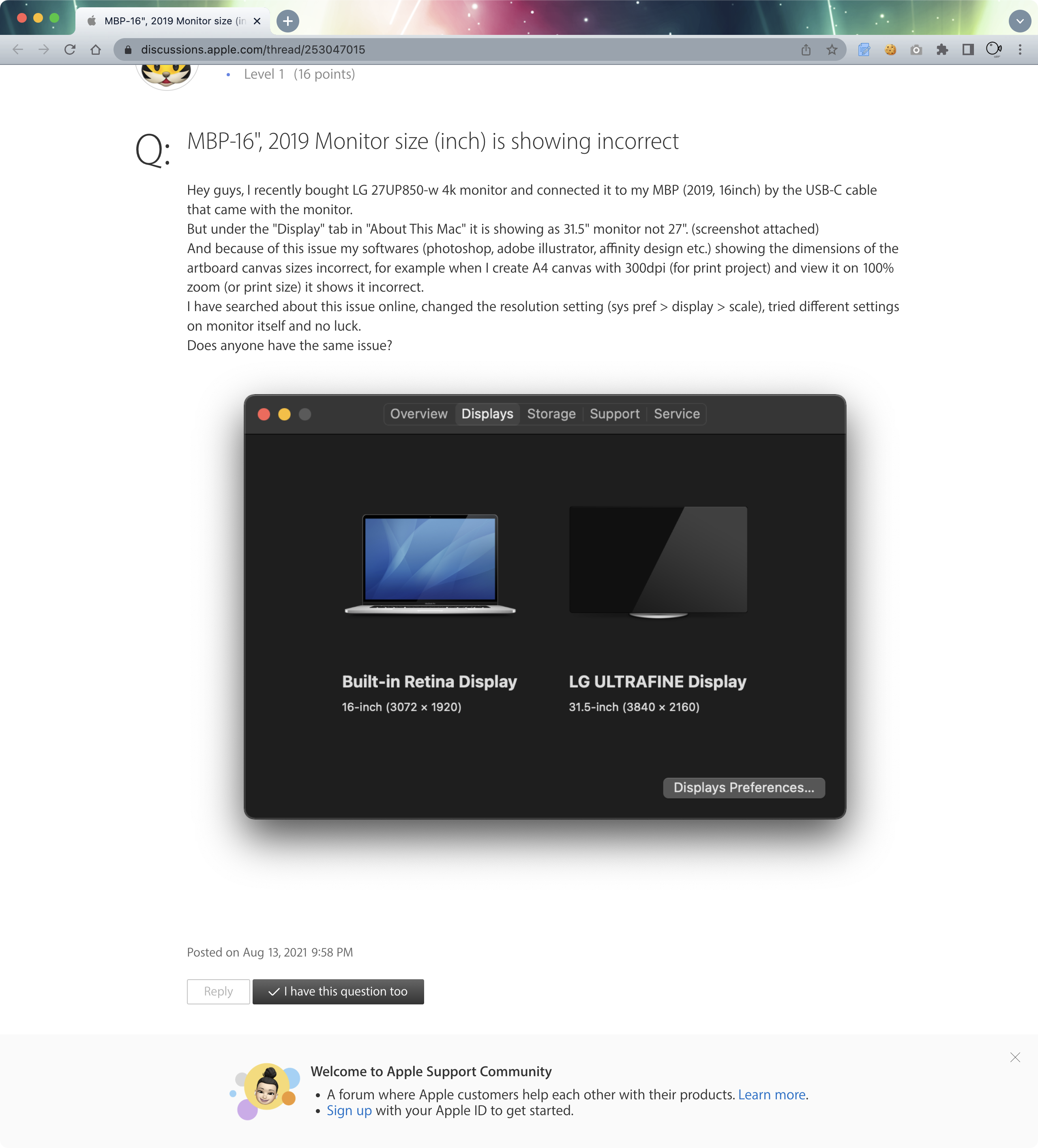 왜 그럴까 싶었는 디스플레이 설정에 LG 27up850 크기가 잘못 나와 있었다.