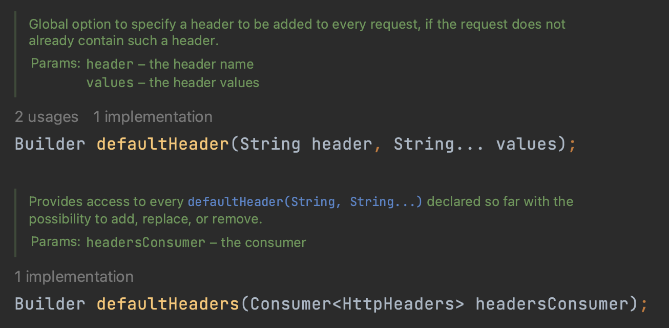 defaultHeader를 설정하는 함수는 스프링 5.3.22 버전 기준 두 가지가 있다.