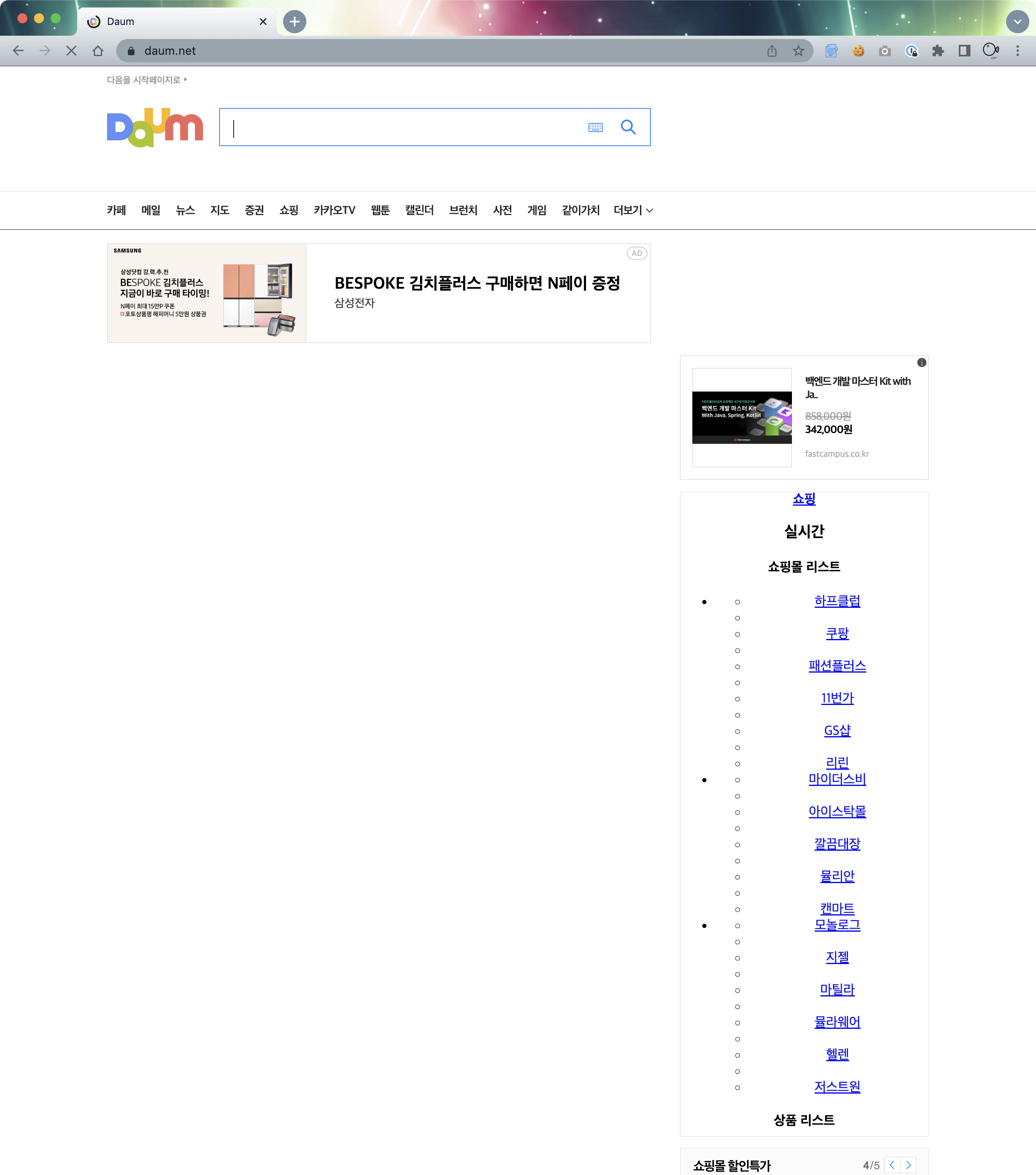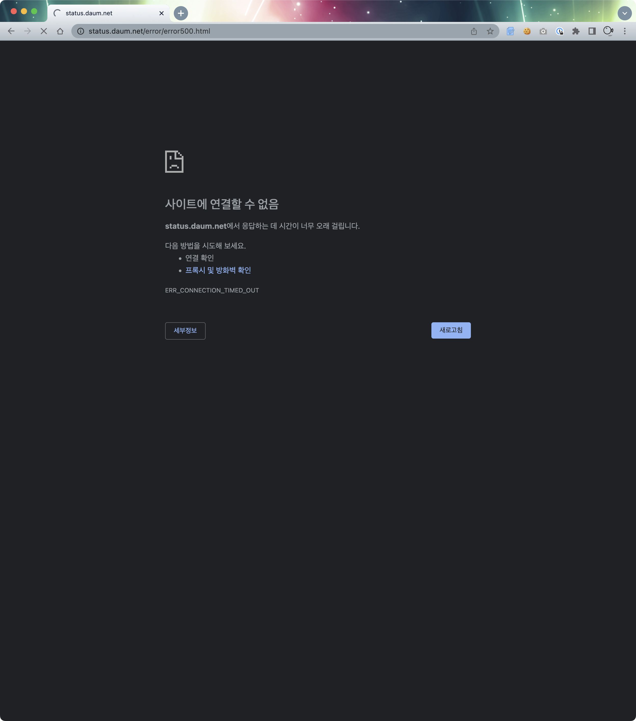 <span class="excerpt">카카오가 장애가 나면서 여러 다른 서비스들이 장애가 났다. 카카오톡은 말할 것도 없고.. daum 메인 화면도 이렇고.. 위의 화면은 아래와 같이 500 응답으로 바뀐다. 지금은 정상화가 되었지만 여기 티스토리도 504 응답이 돌아왔다. 같은 시각 티스토리 에러메시지 --- 2022-10-18 10:21:14 어제 글 쓰는 것은 되었지만 글 조회가 되지 않았다. 오늘은 글 조회는 되지만 PC 버전으로 조회가 되지 않고 모바일로 redirection 이 되어 버린다. http https://namocom.tistory.com/ HTTP/1.1 302 Found Content-Length: 1 Content-Type: text/html; charset=UTF-8 Date: Tue, 18 Oct 2022 01..</span>