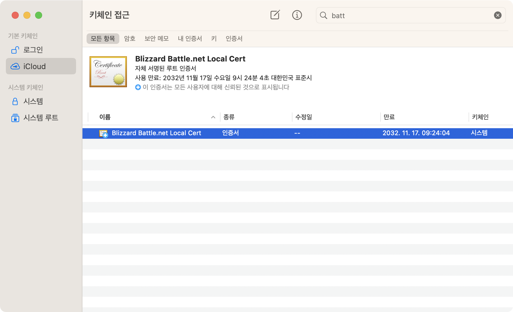 해당 작업 후에 keychain에 보니 "Blizzard Battle.net Local Cert" 라는 인증서가 추가되었음을 알 수 있었다.