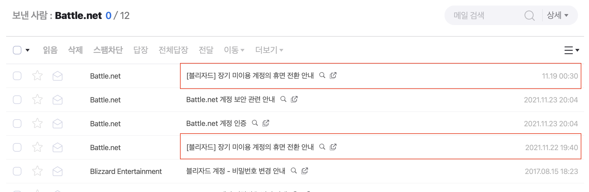 블리자드 회원 가입을 11월에 해서 그런지 11월에 장기 미이용 계정의 휴면 전환 안내 메일이 또 왔다.