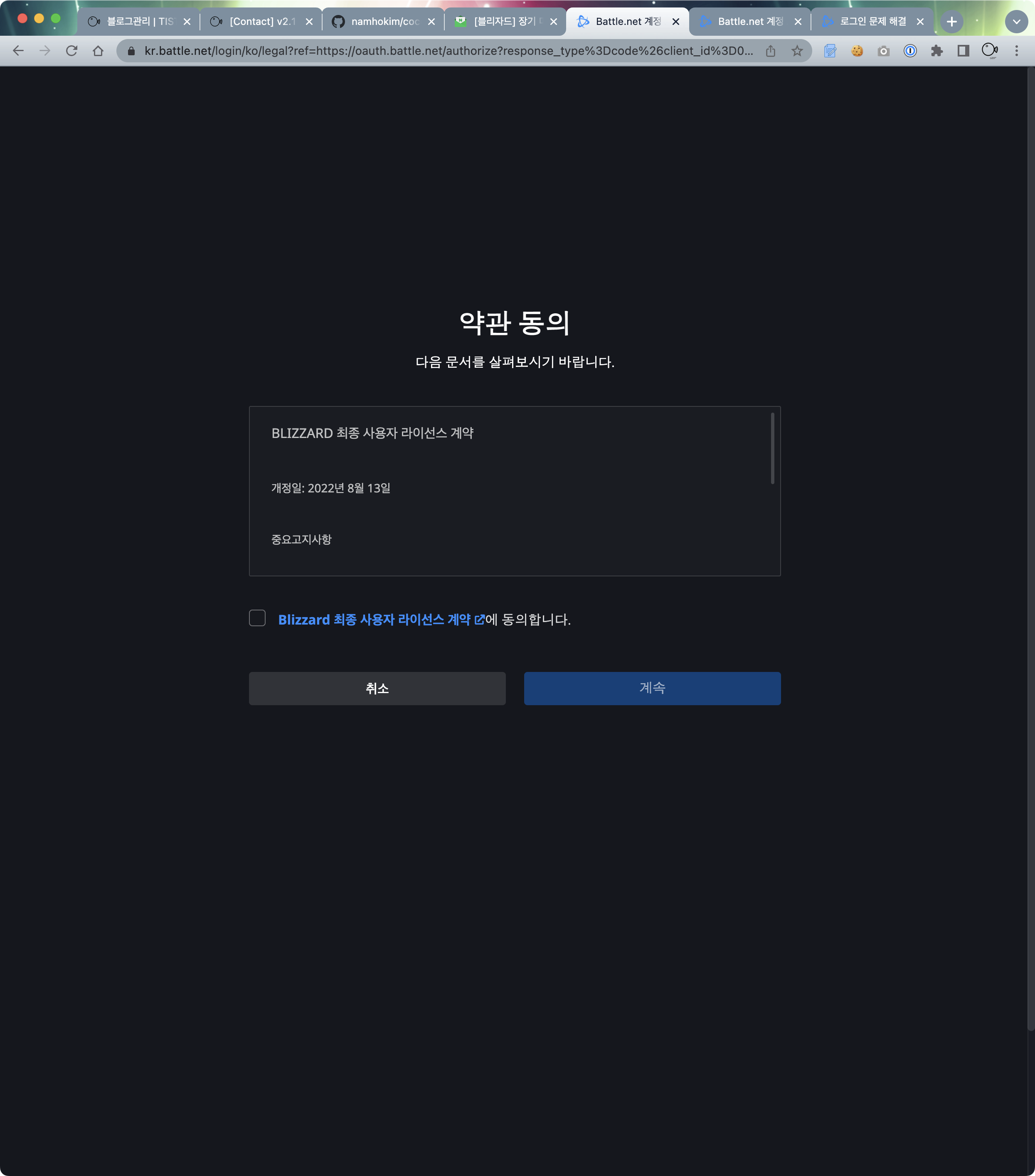 동의를 하고 계속 버튼을 눌렀더니 로그인이 잘되지 않았다. (다시 로그인 화면으로 나왔는지 또 다른 약관 동의가 나왔는지 블로그를 기록하는 시점에 기억이 불명확하다)