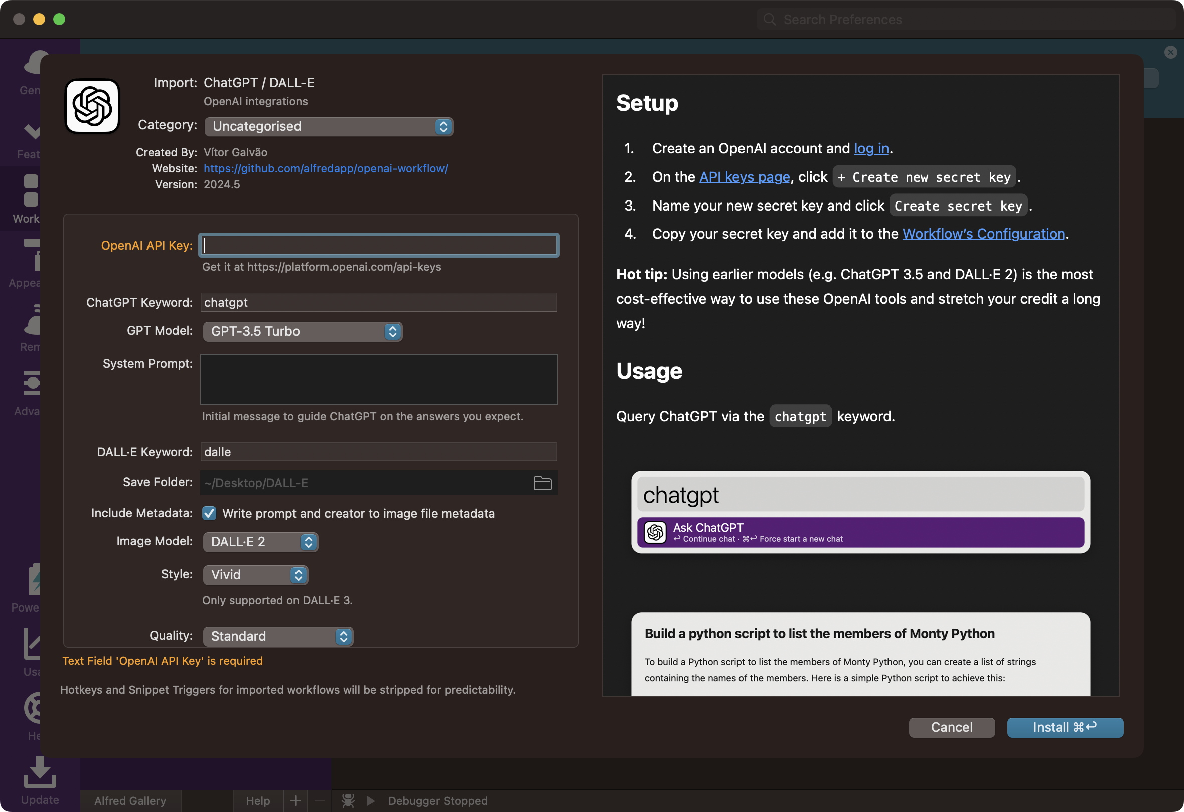 클리앙에서 발견한 알프레드 워크플로우: https://alfred.app/workflows/alfredapp/openai/