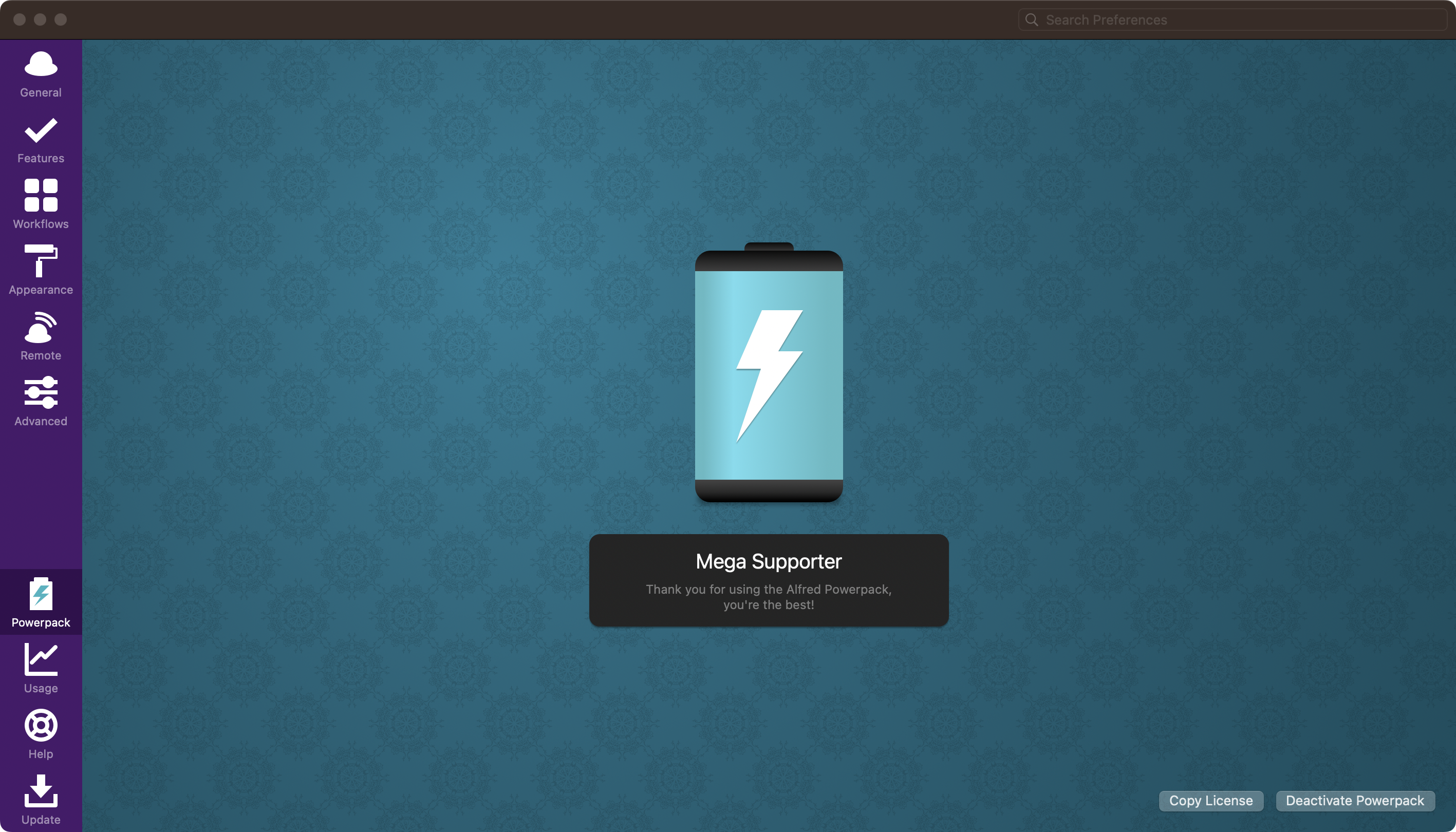 The Legendary license offers the same benefits as the Mega Supporter, and lets you show your continued support to the Alfred team!
