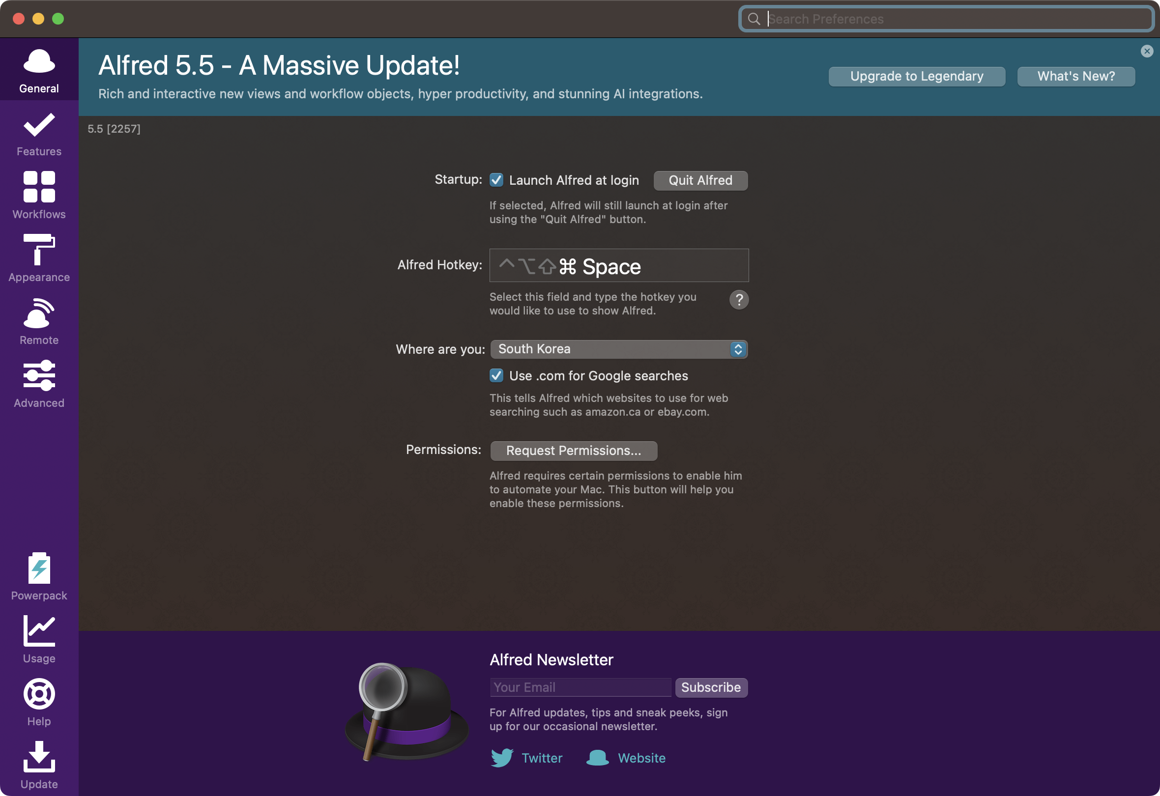 "Update and restart Alfred" 버튼을 누르면 "A Massive Update!"라고 뜨면서 "Upgrade to Legendary"버튼을 한 번 더 눌러야 한다.