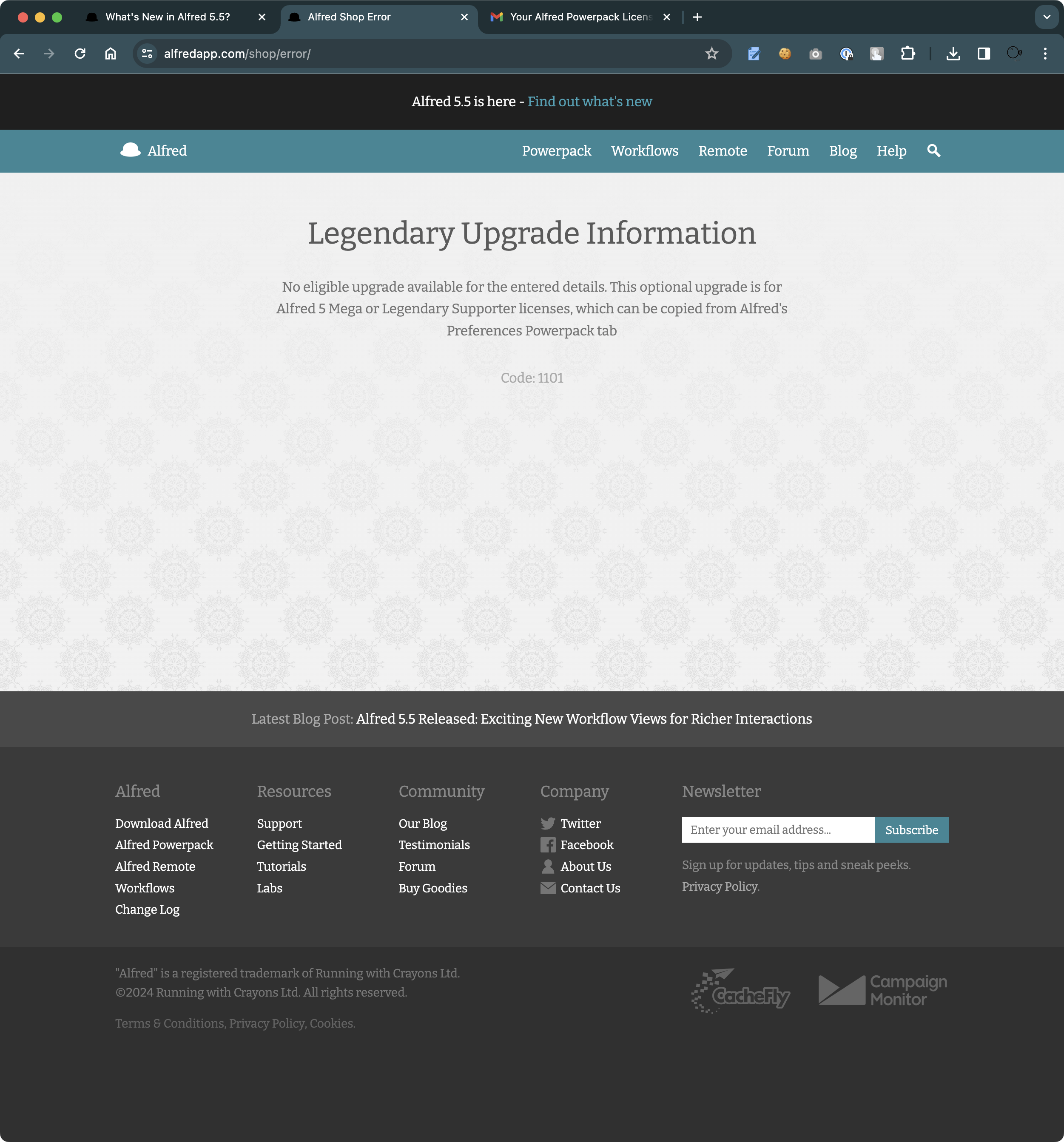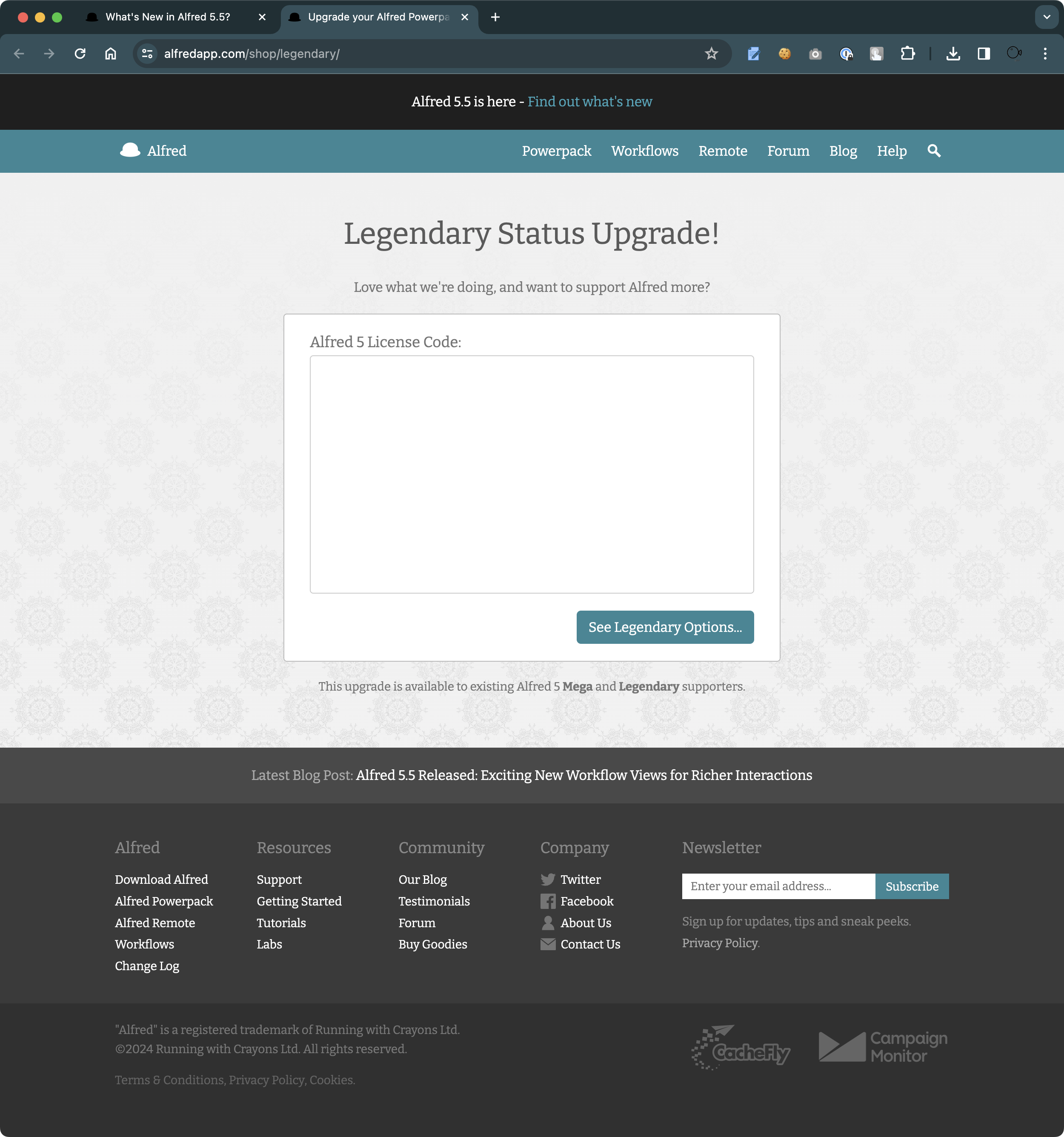 하지만 이 업그레이드를 위해서는 "Upgrade to Legendary" 버튼을 눌러야 하고 기존의 Alfred 5 라이센스 코드을 입력해야 한다.