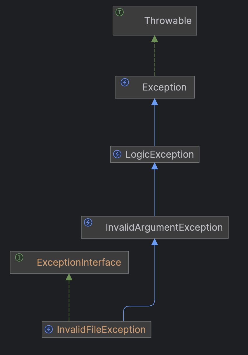 InvalidFileException 라는 예외를 발생시키는데 계층은 SPL 예외 중 하나인 InvalidArgumentException를 상속하고 있다.