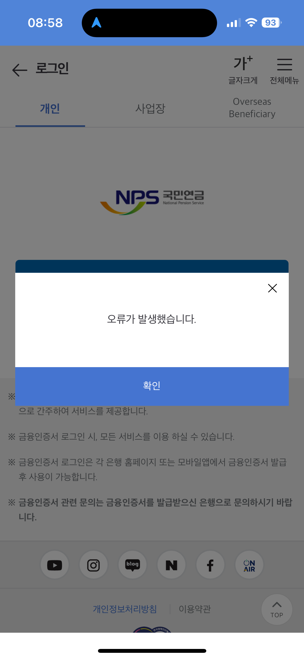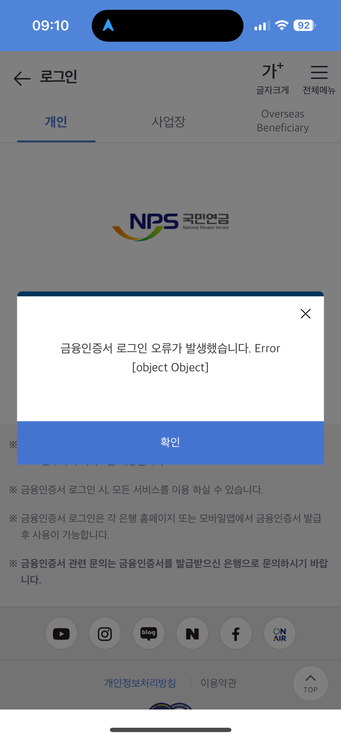 두 번째는 "금융인증서 로그인 오류가 발생했습니다."라는 좀 더 구체적인 메시지가 나왔다.