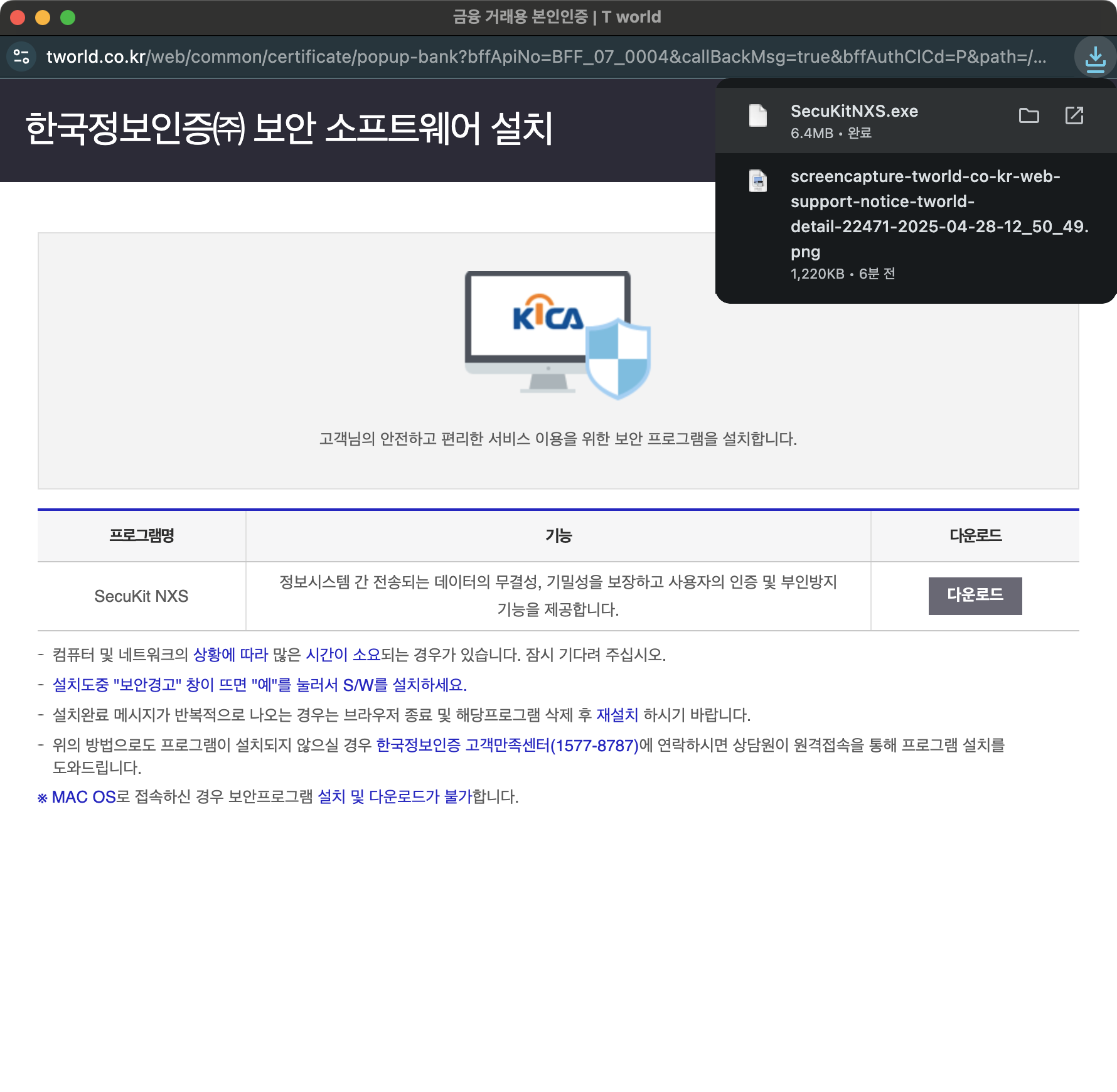 "MAC OS로 접속하신 경우 보안프로그램 설치 및 다운로드가 불가"하다는 메시지가 있었다.