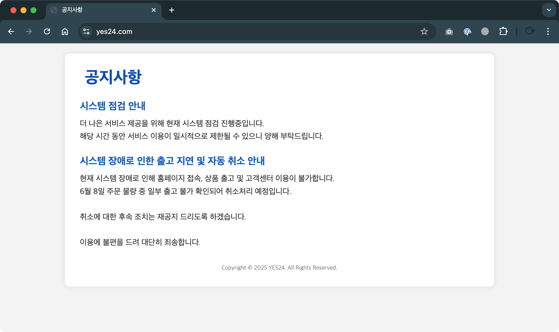 <div class="notice-title">예스24 서비스 접속 오류 안내</div>