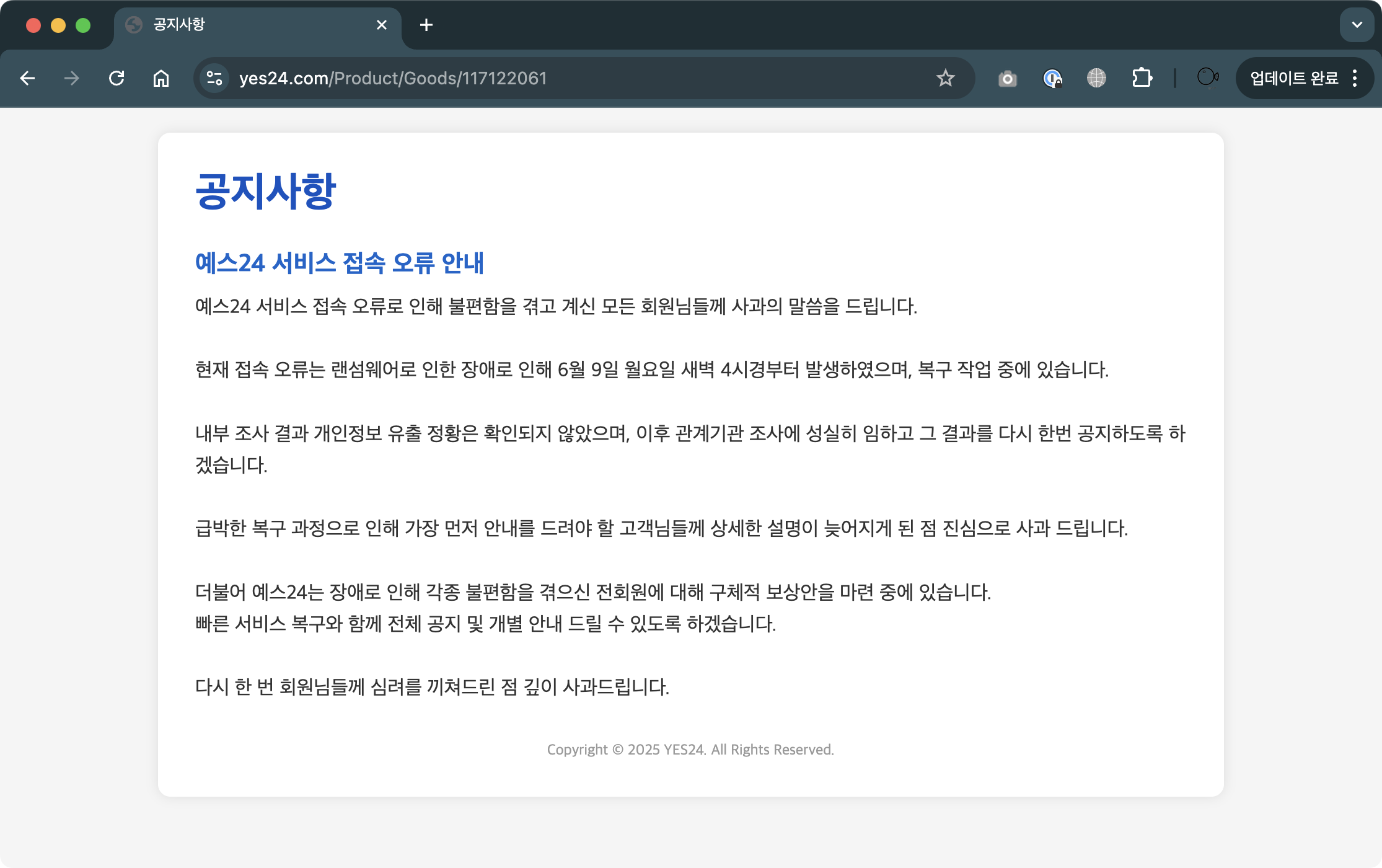 2025-06-10 15:21 접속 오류가 랜섬웨어로 인한 장애라고 예스24에서 공지를 했다.
