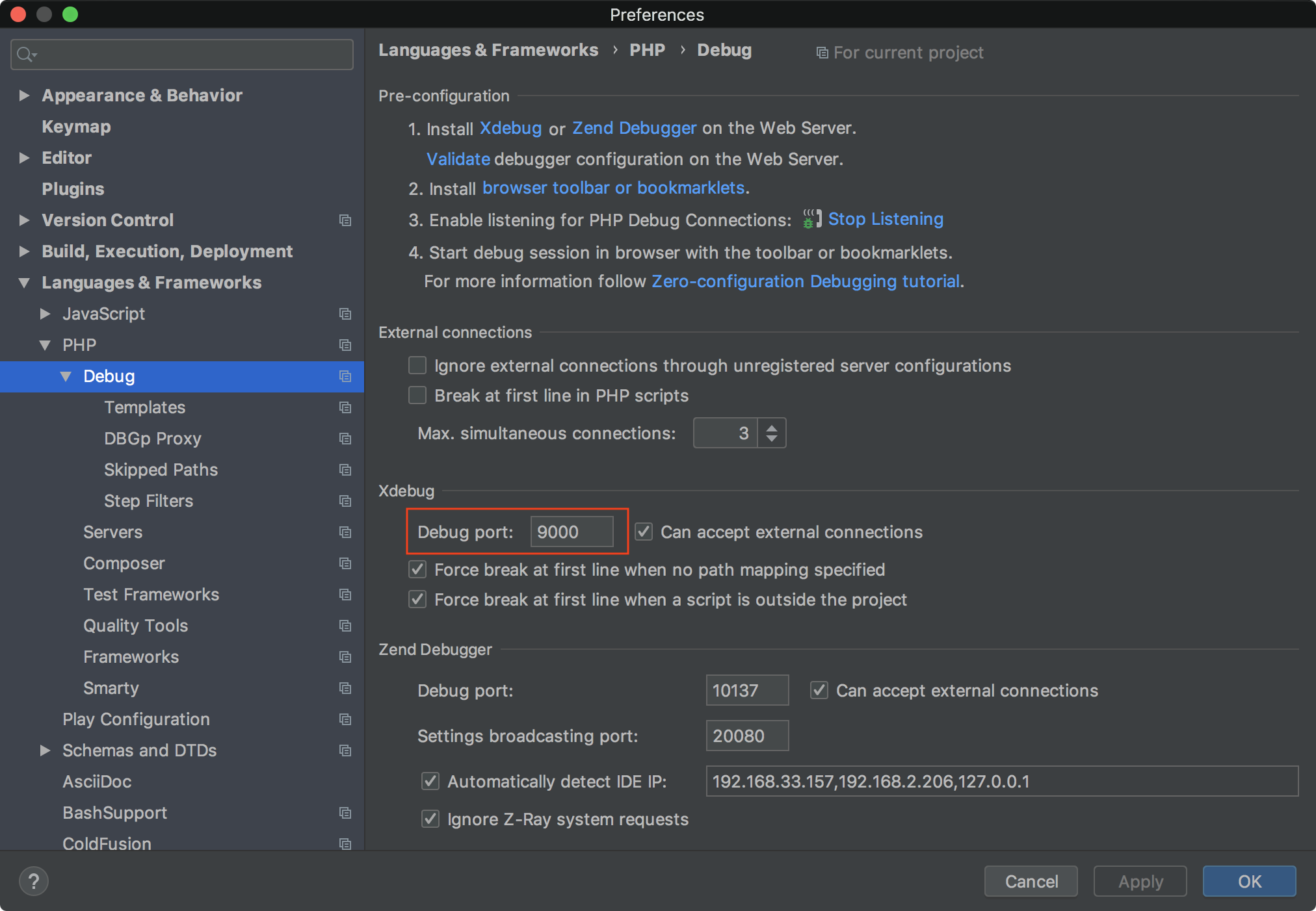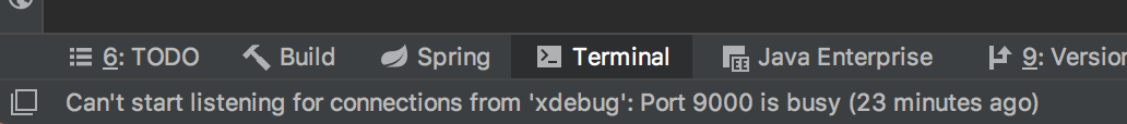환경설정에서 찾아보니 PHP 하위에 Debug에 Xdebug라는 포트가 9000으로 설정되어 있었다.