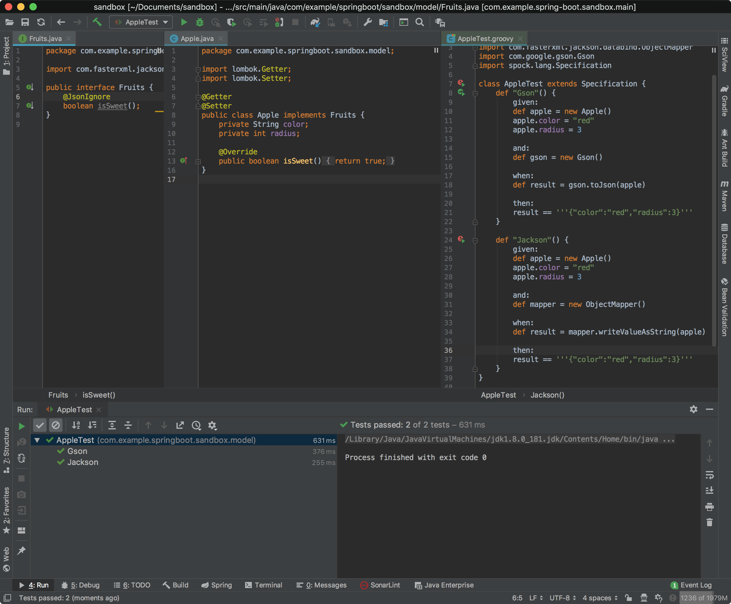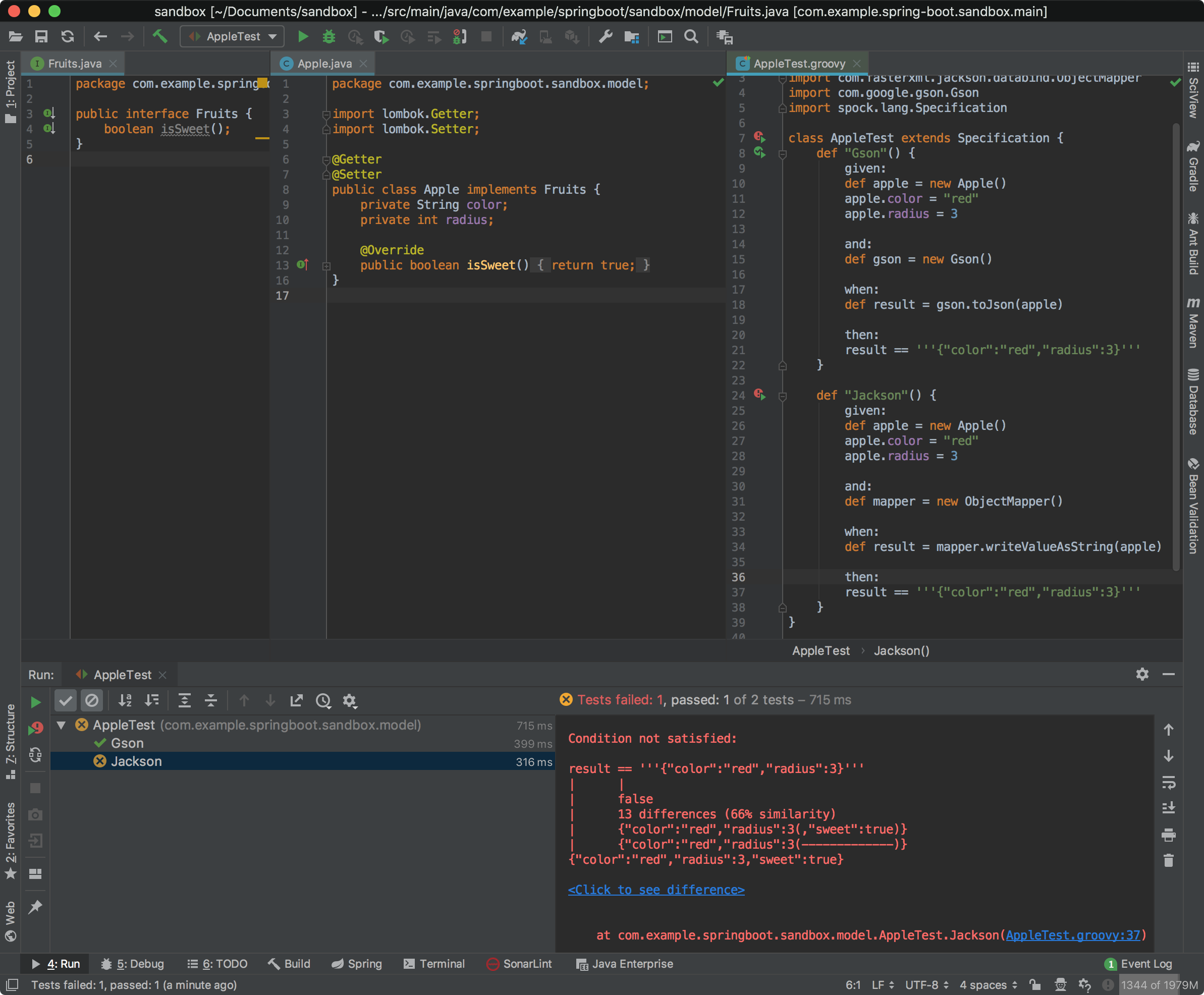 Fruits 인터페이스의 isSweet 메서드에 @JsonIgnore를 붙이면 테스트는 성공한다.