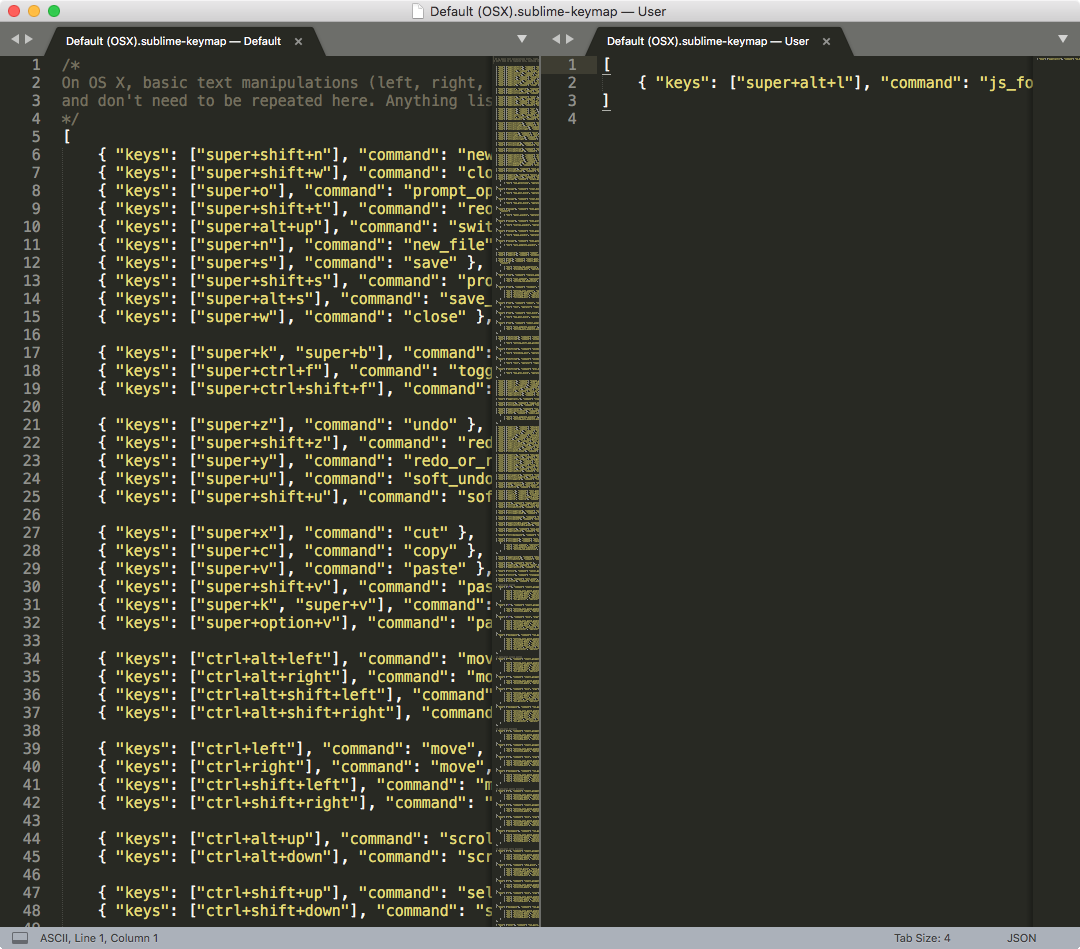 { "keys": ["super+alt+l"], "command": "js_format", "context": [{"key": "selector", "operator": "equal", "operand": "source.js,source.json"}] }