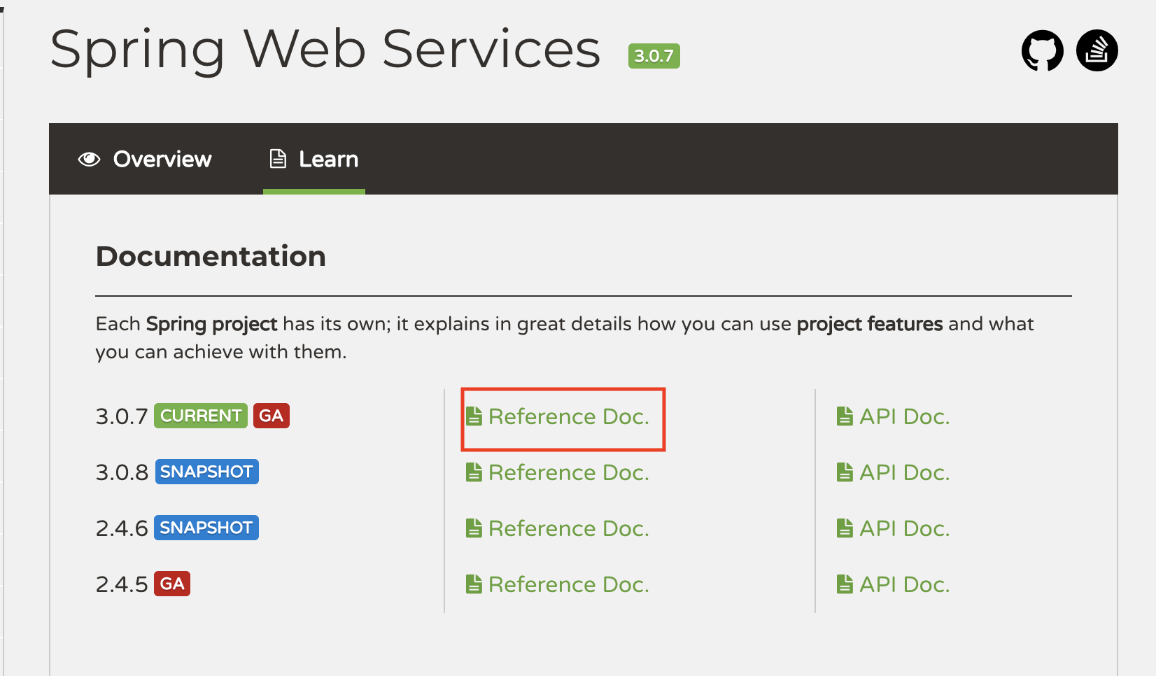Learn 탭에 보면 레퍼런스 문서가 있는데, 스프링에서 SOAP 클라이언트를 구현하기 위해 가장 적합하다.