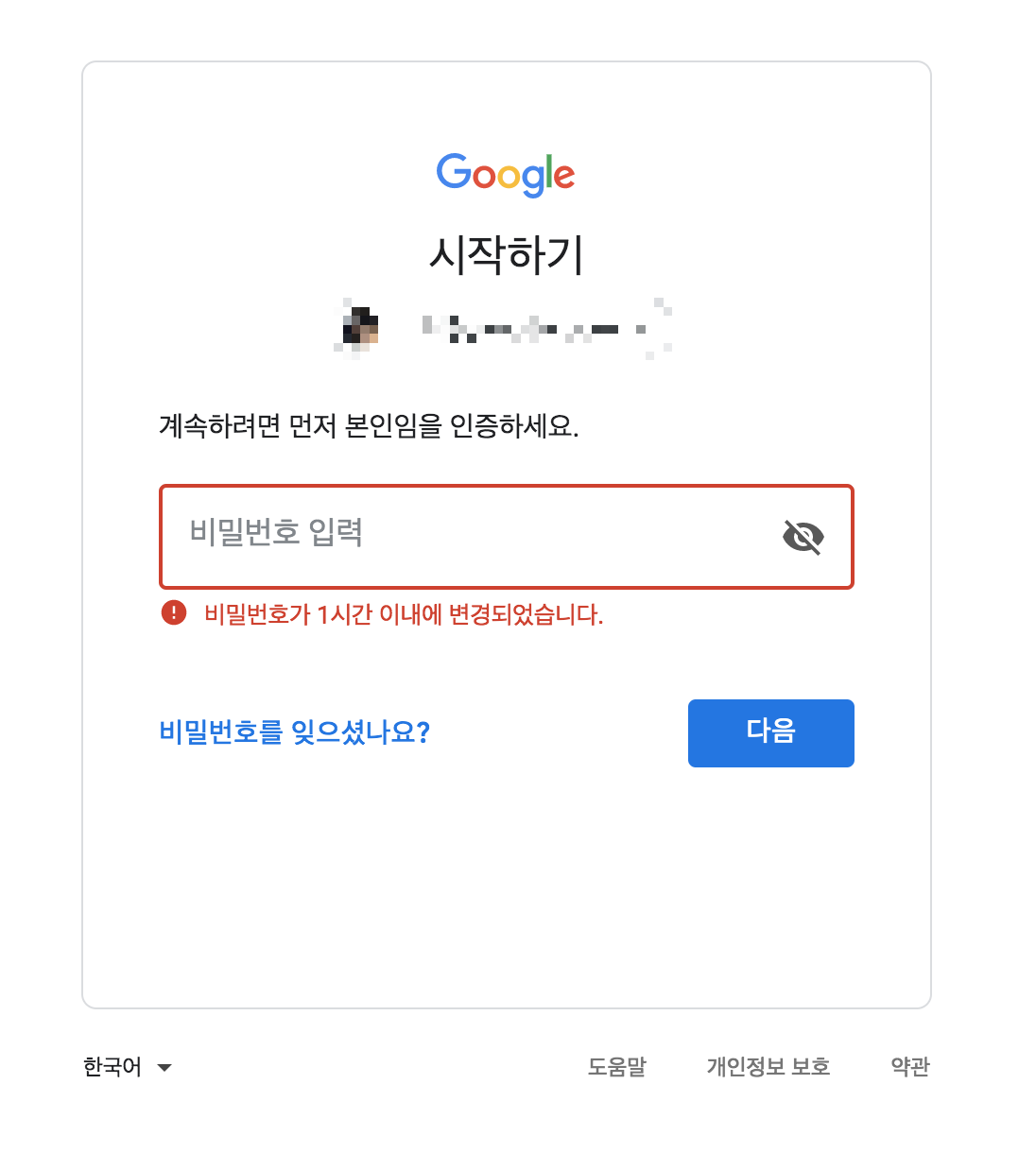 구글에서 비밀번호 변경을 하고, 바뀌기 이전 비밀번호 등의 틀린 비밀번호를 넣었을 경우 아래와 같은 메세지가 나온다.