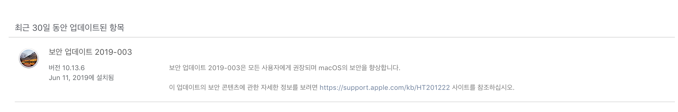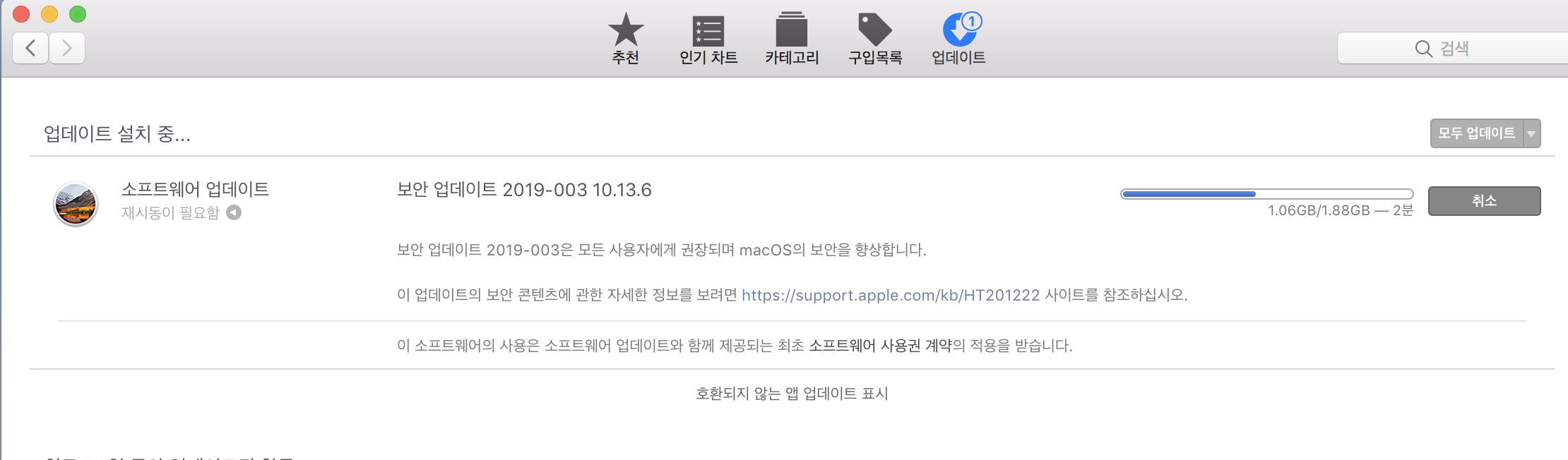 어제 저녁에 보안 업데이트 2019-003 을 걸어두고 갔다.