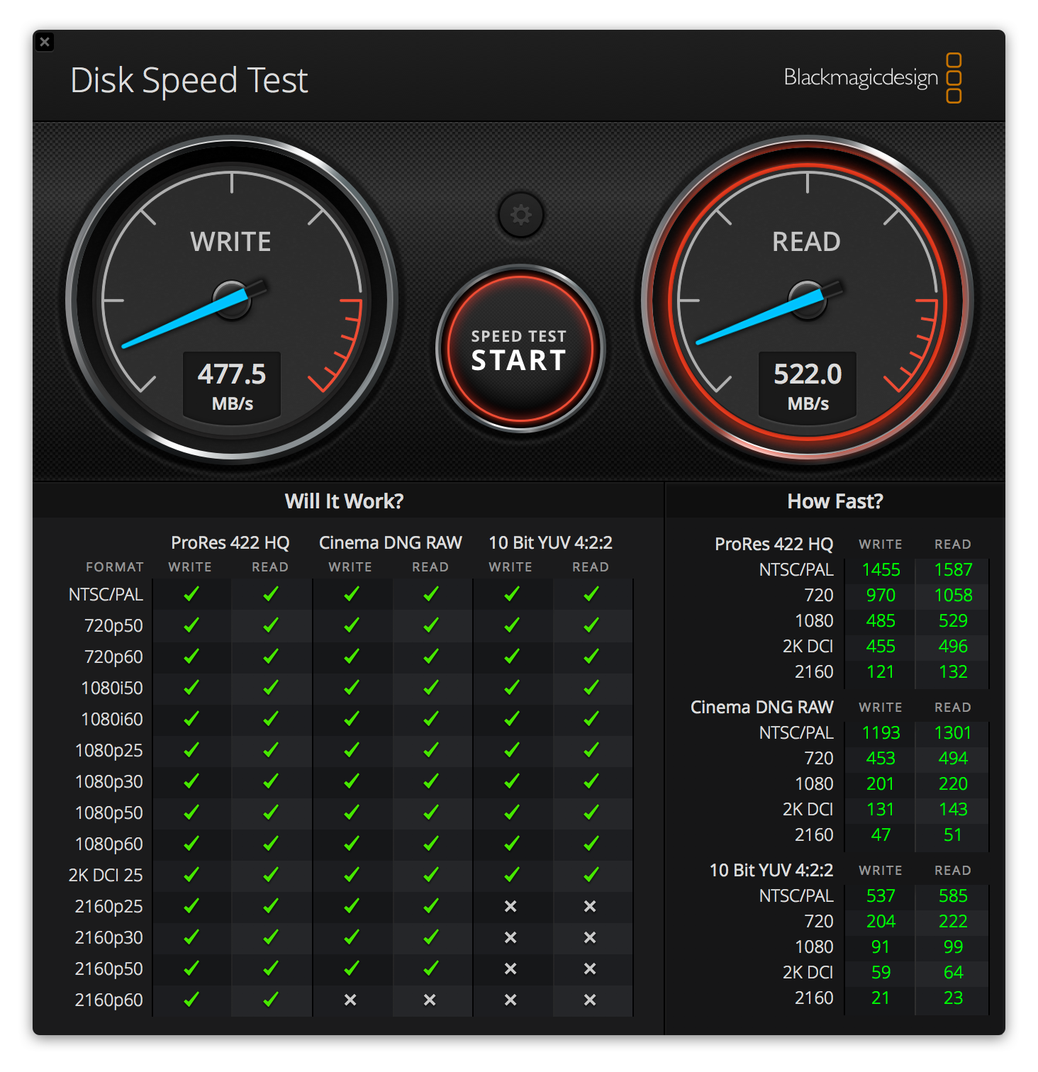 Blackmagic Design Disk Speed Test 라는 앱으로 벤치마킹을 해보았다.
