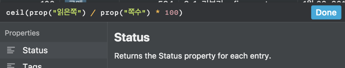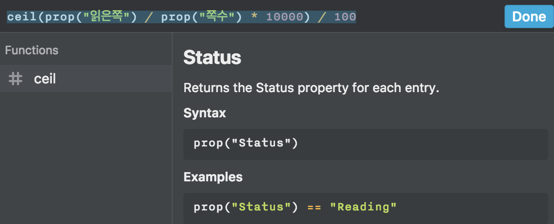 ceil(prop("읽은쪽") / prop("쪽수") * 10000) / 100