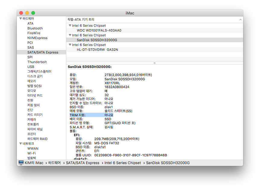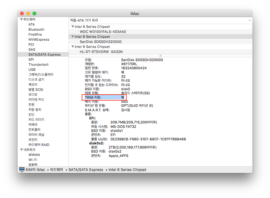 다시 들어와보면 TRIM 지원이 예로 바뀌어 있다.