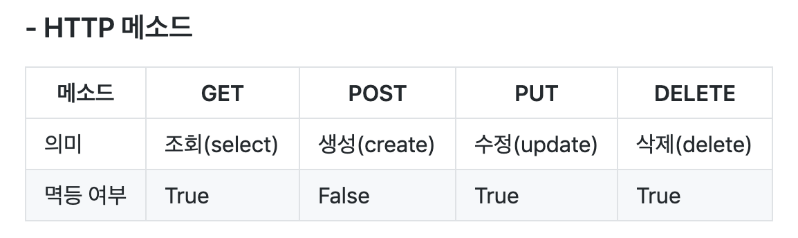 특정 서버에 대해 여러 동일한 요청이 단일 요청에 대한 효과와 동일한 경우 해당 메서드는 "멱등(idempotent)"으로 간주합니다.