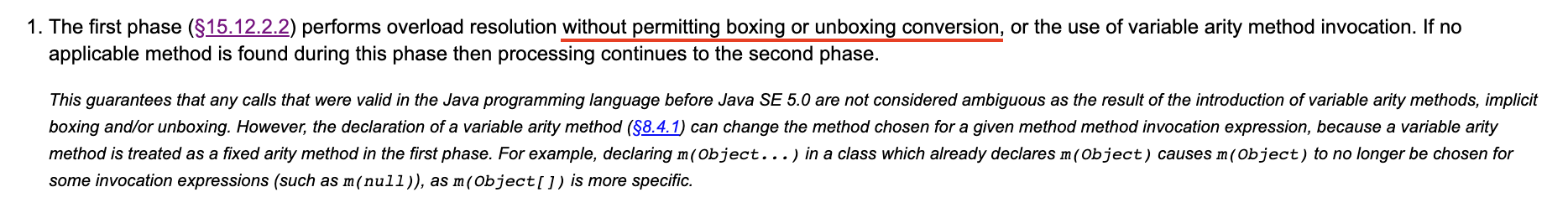 하지만 $§15.12.2.2 적용시 박싱이나 언박싱 변환의 수행이 이루어지는 것은 제외한다(without permitting boxing or unboxing conversion)고 정의되어 있다.