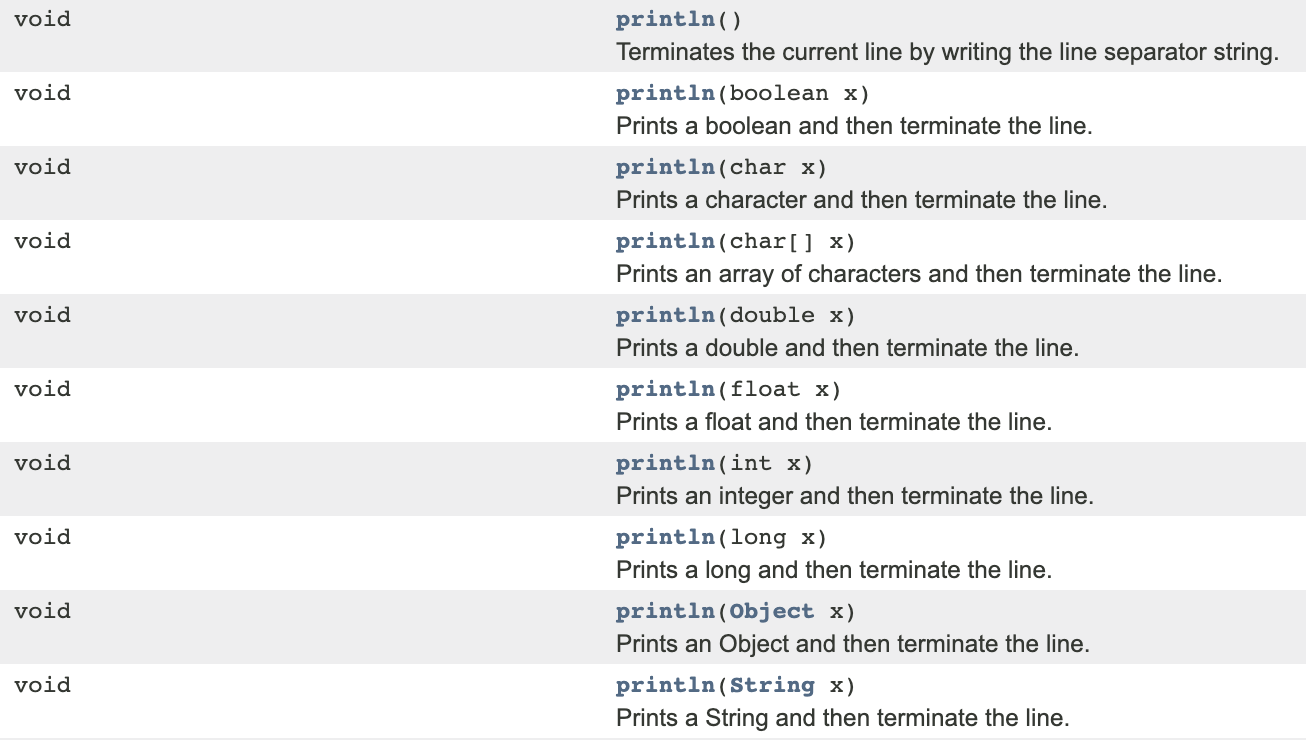 PrintStream JavaDoc 문서를 보면 print 나 println 같은 출력 메서드들이 여러가지로 오버로딩되어 있음을 알 수 있다.