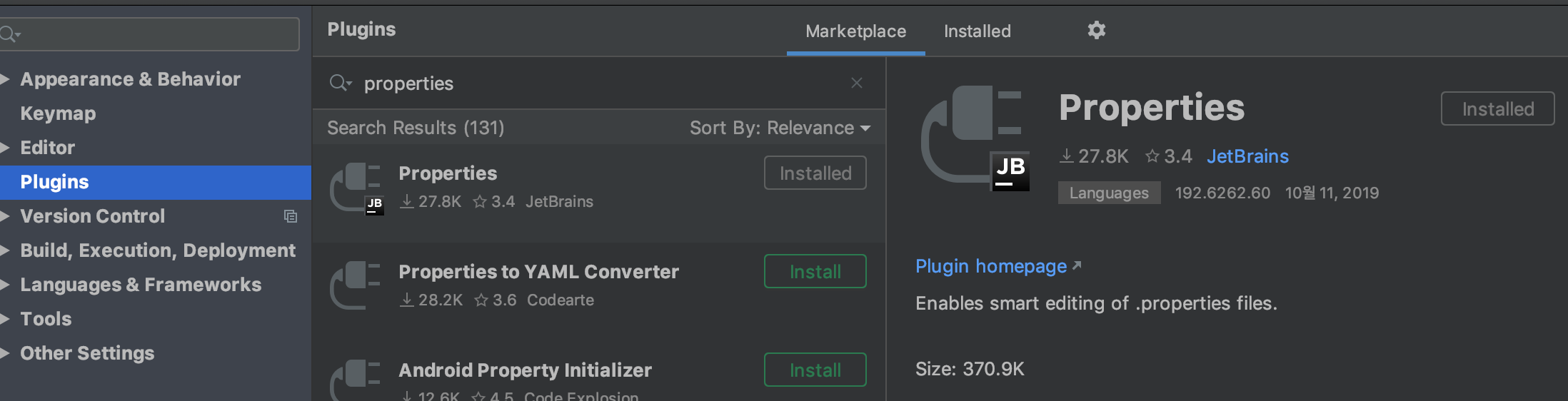 혹시 플러그인을 설치해야 해서 Marketplace에서 검색을 해보니 JetBrains에서 제공하는 플러그인이 기본으로 설치되어 있었다.