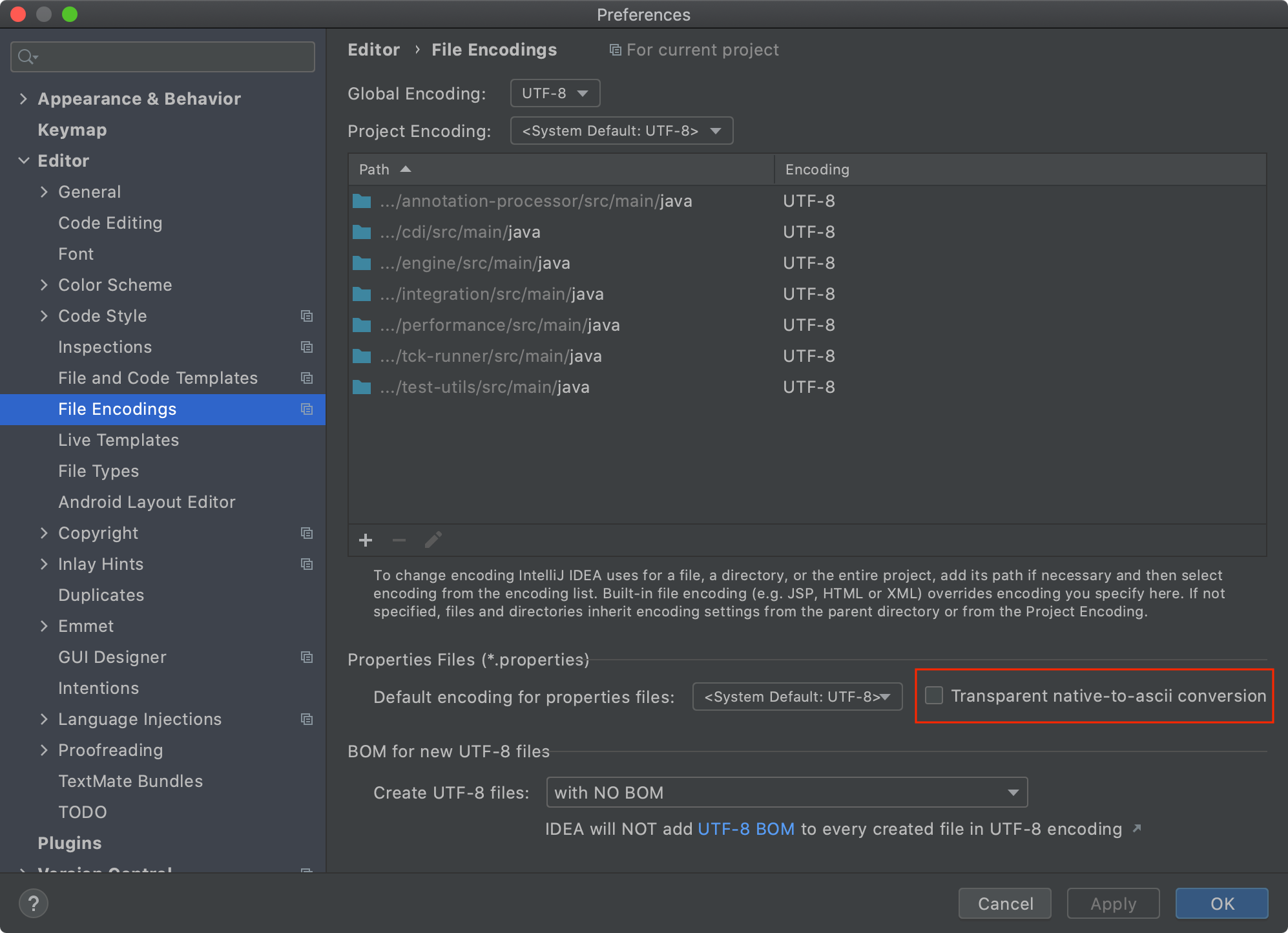 혹시 한글이 위와 아래와 같이 코드로 보이는 경우 Transparent native-to-ascii conversion 를 체크해준다. ref