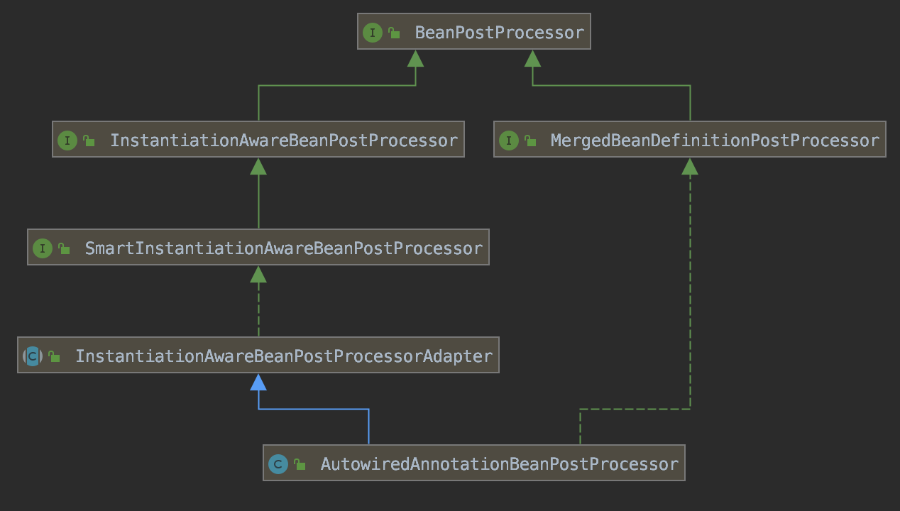 AutowiredAnnotationBeanPostProcessor 는 아래 그림처럼 InstantiationAwareBeanPostProcessor 인터페이스를 구현하고 있는데
