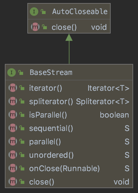 BaseStream 인터페이스는 위의 다이어그램에 적혀있는 메서드들을 가지고 있는 인터페이스이다.