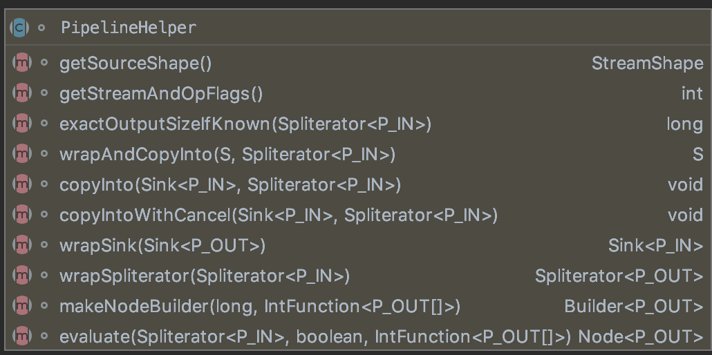 최상위 클래스인 PipelineHelper 추상 클래스의 경우 JDK 8 기준 10개의 추상 메서드가 정의되어 있는데 아래와 같다.