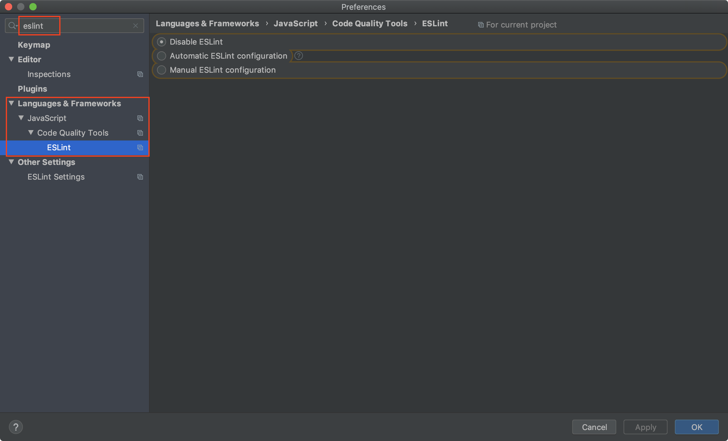 설정쪽에 eslint로 검색을 해보니 Disable ESLint로 되어 있었다.