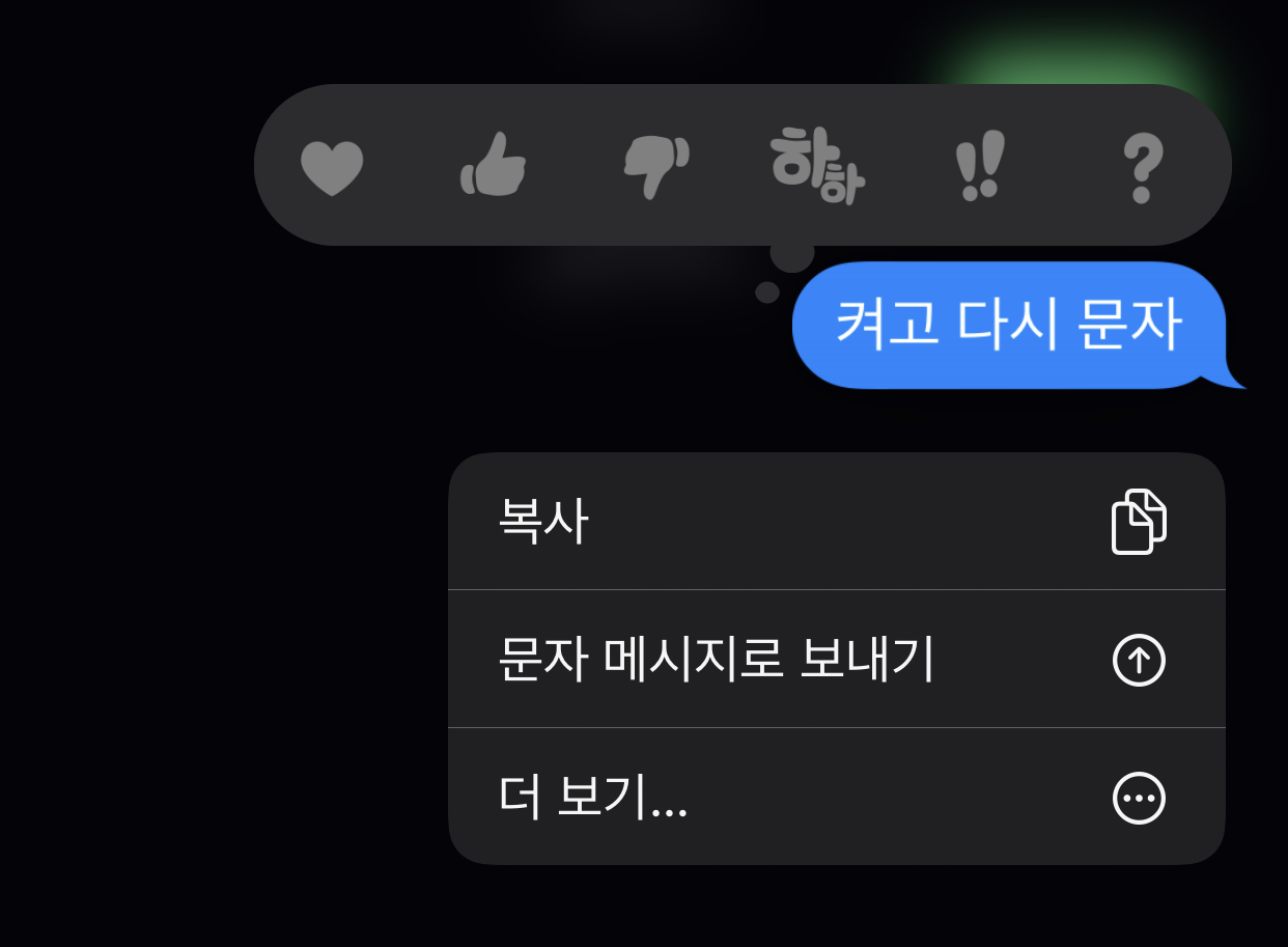 만약 바로 문자메시지로 보내고 싶다면 파란색 메시지일 경우 꾹 누르고 있으면 '문자 메시지로 보내기'를 선택할 수 있다.