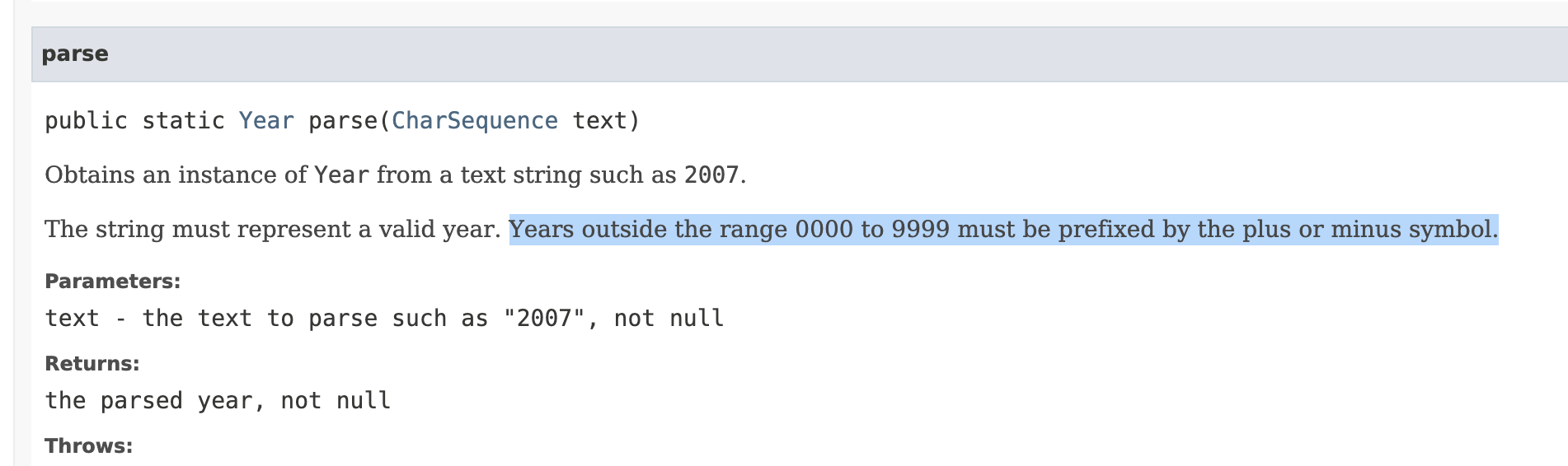 그런데 Java8의 Year 클래스의 parse 메서드의 JavaDoc 문서를 보면 0000 ~ 9999 밖의 년도에는 + 나 - 기호를 붙여야 한다고 되어 있다.
