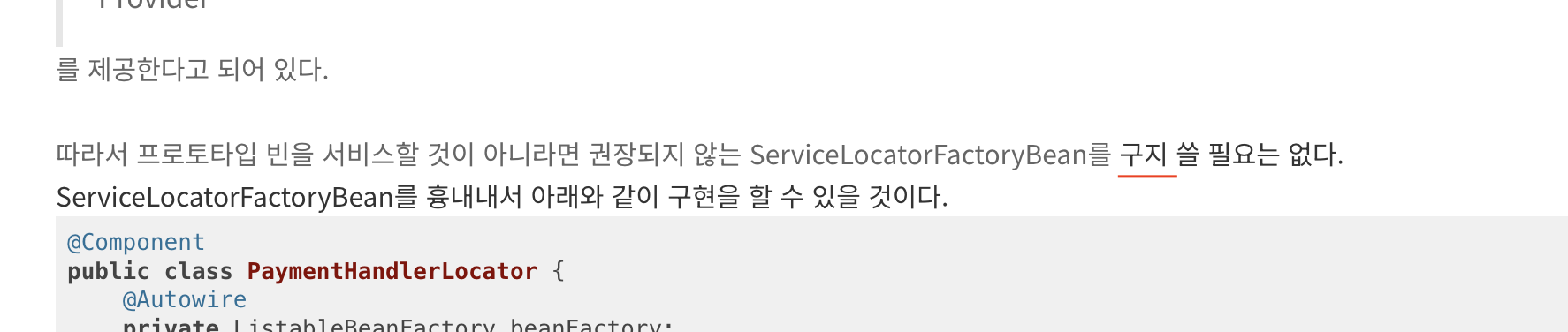 따라서 프로토타입 빈을 서비스할 것이 아니라면 권장되지 않는 ServiceLocatorFactoryBean를 굳이 쓸 필요는 없다.