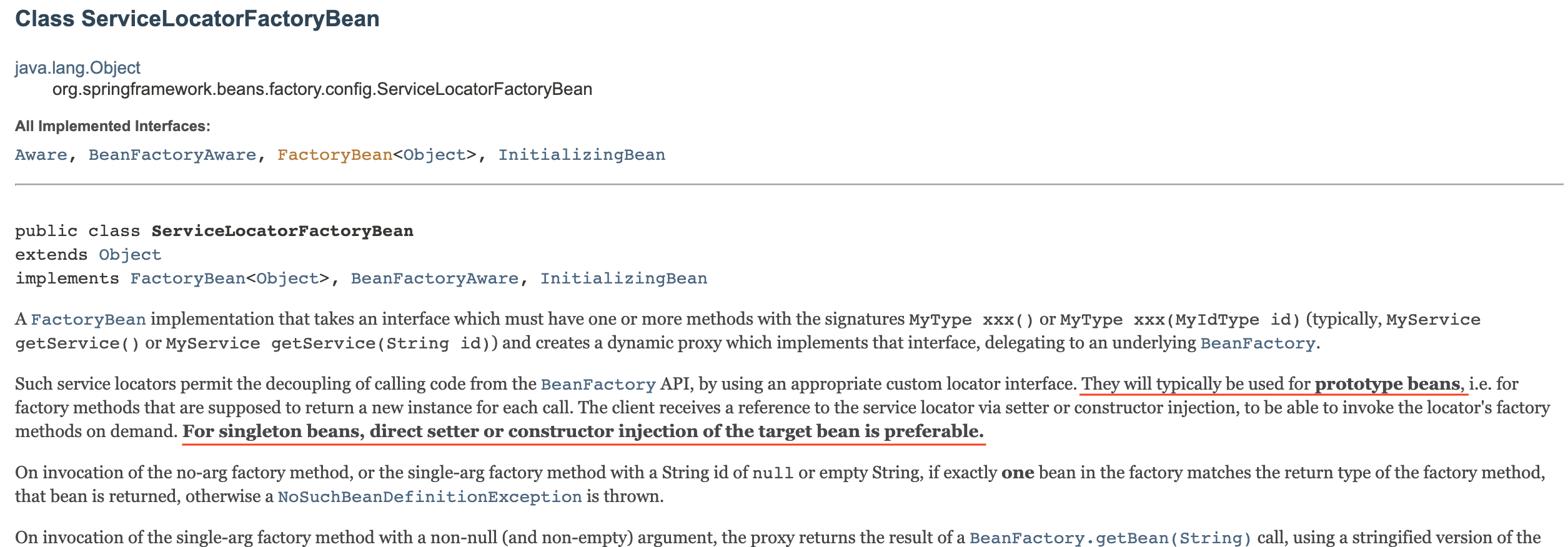 https://docs.spring.io/spring-framework/docs/current/javadoc-api/org/springframework/beans/factory/config/ServiceLocatorFactoryBean.html 를 보면 전형적으로 prototype beans에 대해서 사용한다고 되어 있다.