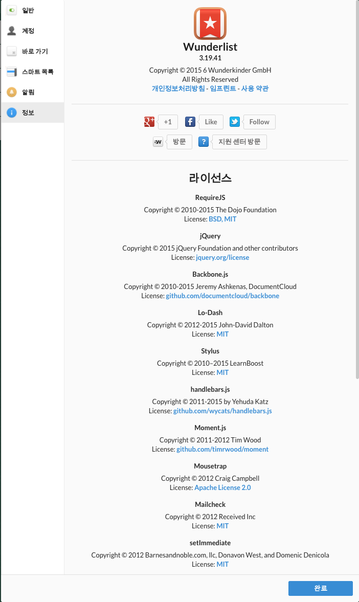 Wunderlist가 2020년 5월 6일부로 사용이 중단된다고 해서 라이선스 스냅샷을 찍어둔다.