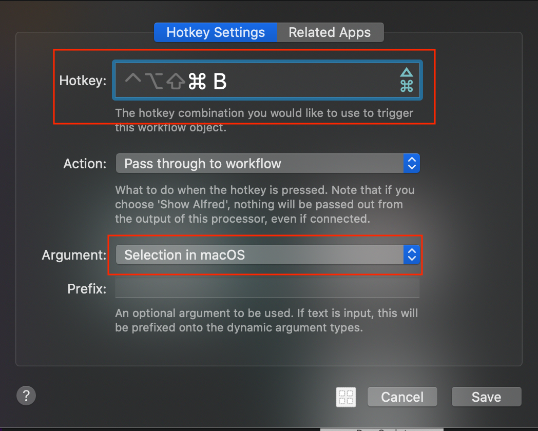 Argument는 해당 이벤트가 발생할 때 인자를 지정할 수 있는데, Selection in macOS를 선택하였다.