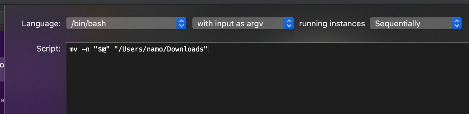 - Actions: 실제적으로 할 동작을 지정한다. 이 글에서는 mv 명령을 실행하는 'Run Script'를 쓸 것이다.
