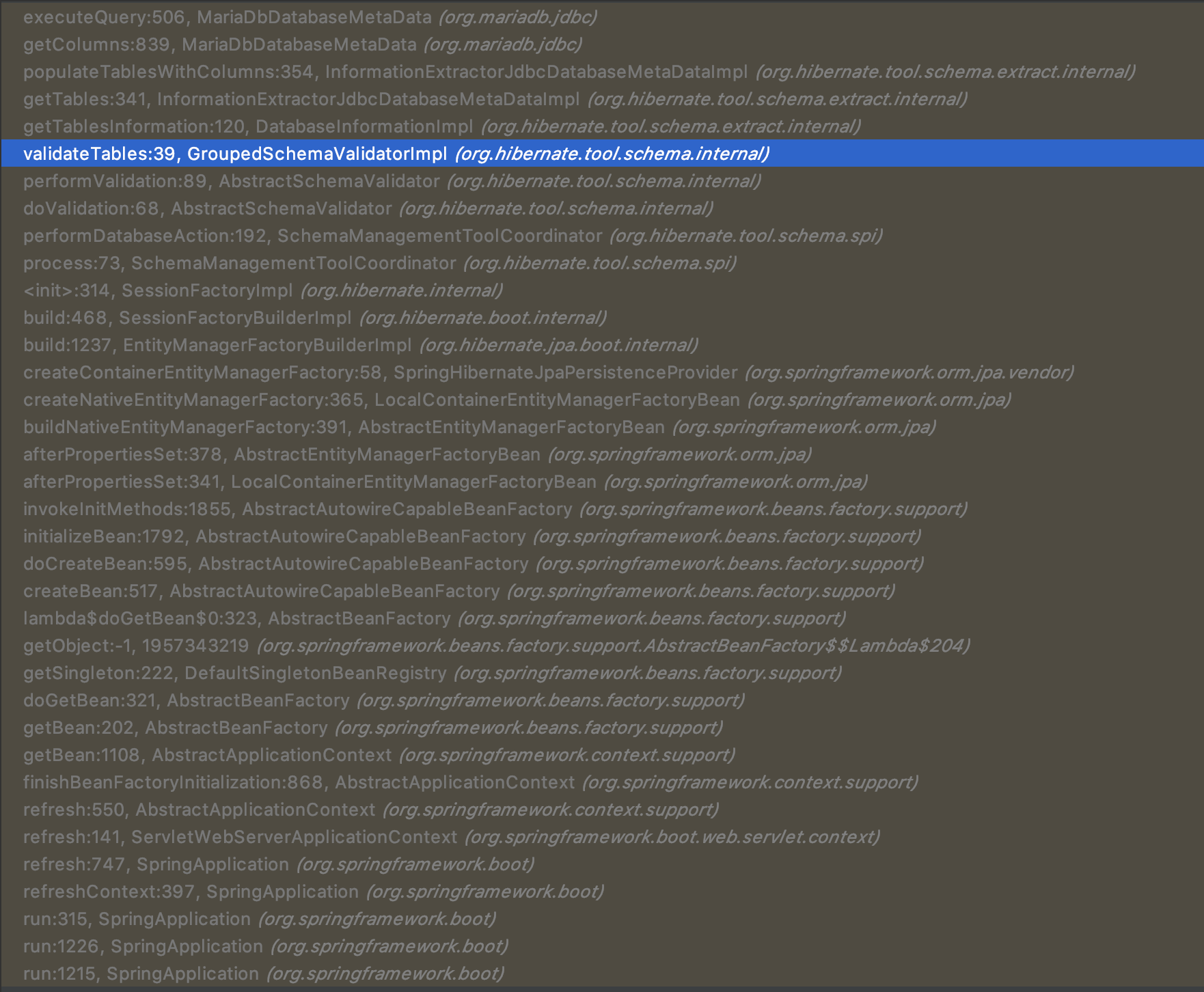 GroupedSchemaValidatorImpl#validateTables <- 여기가 아래에서 파란색 부분이다.