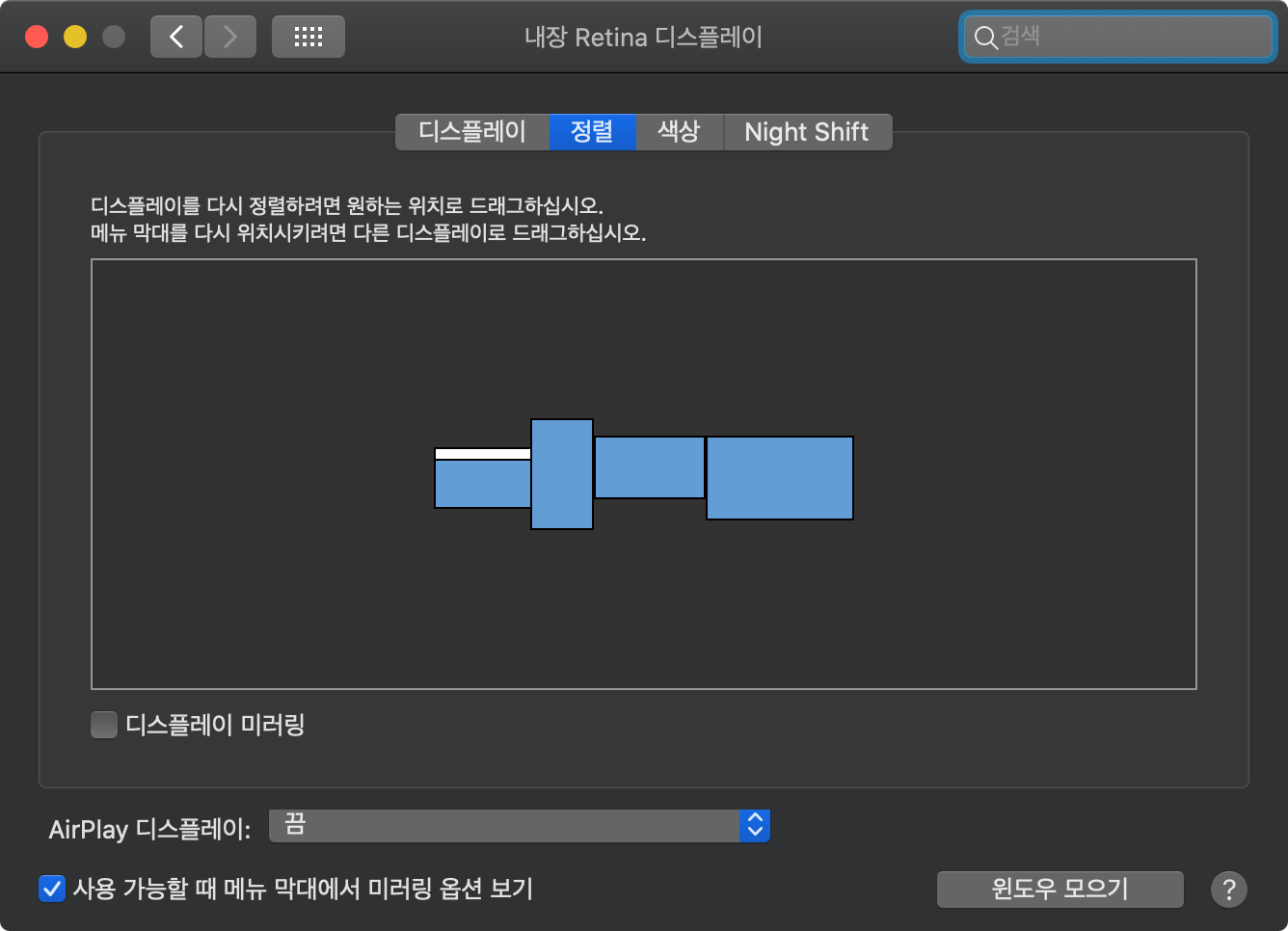아래 처럼 해당 회색 길다란 네모를 드래그를 해서 주 디스플레이로 사용할 곳에 드롭을 하면 된다.