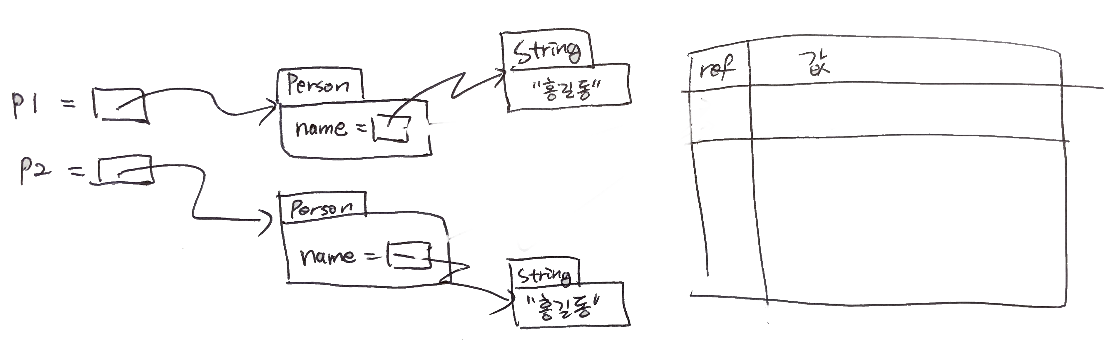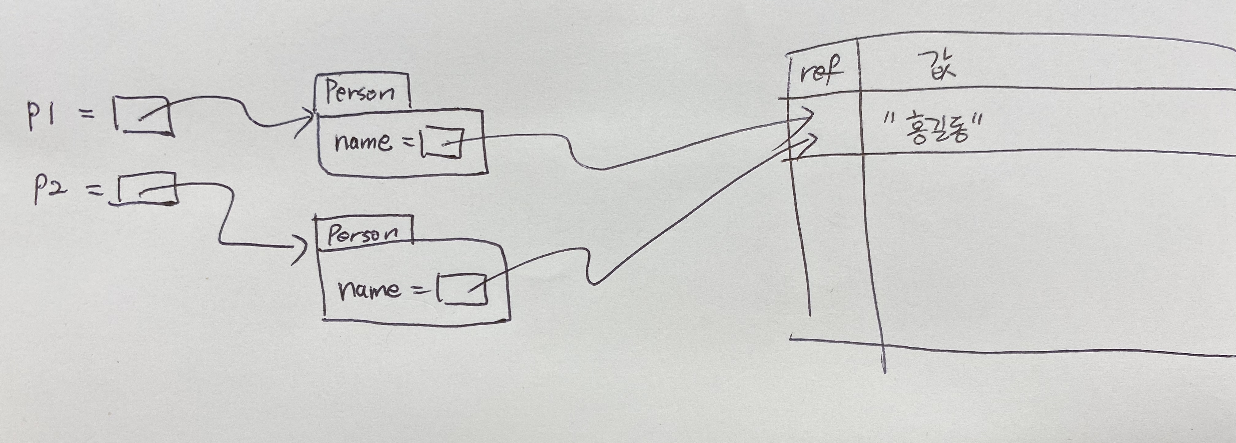 그런데 p2에서도 리터럴 형태로 사용했으므로 p1과 p2의 객체는 새로운 문자열이 만들어지지 않고 이전에 가리켰던 "홍길동"을 가리키게 된다.