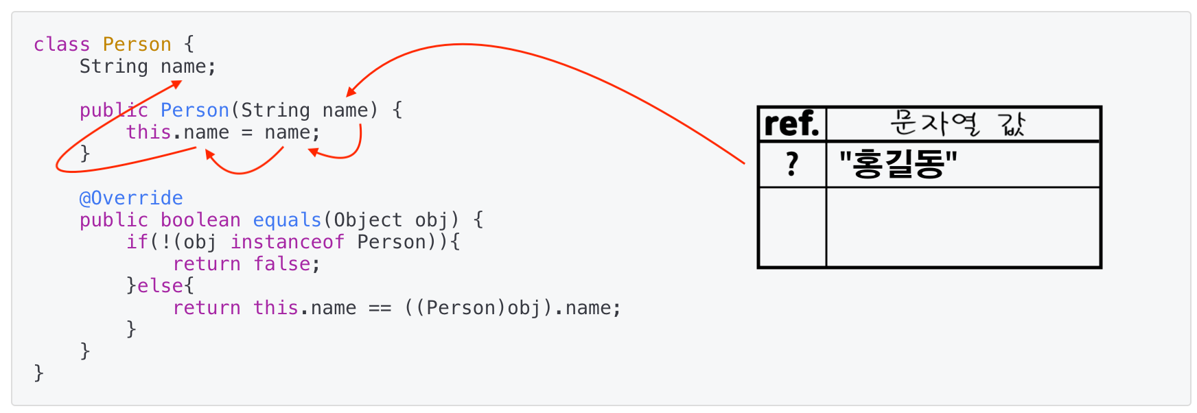 따라서 p1.equals(p2) 의 결과는 false가 된다. (내부적으로는 p1.name == p2.name 이 수행되므로)