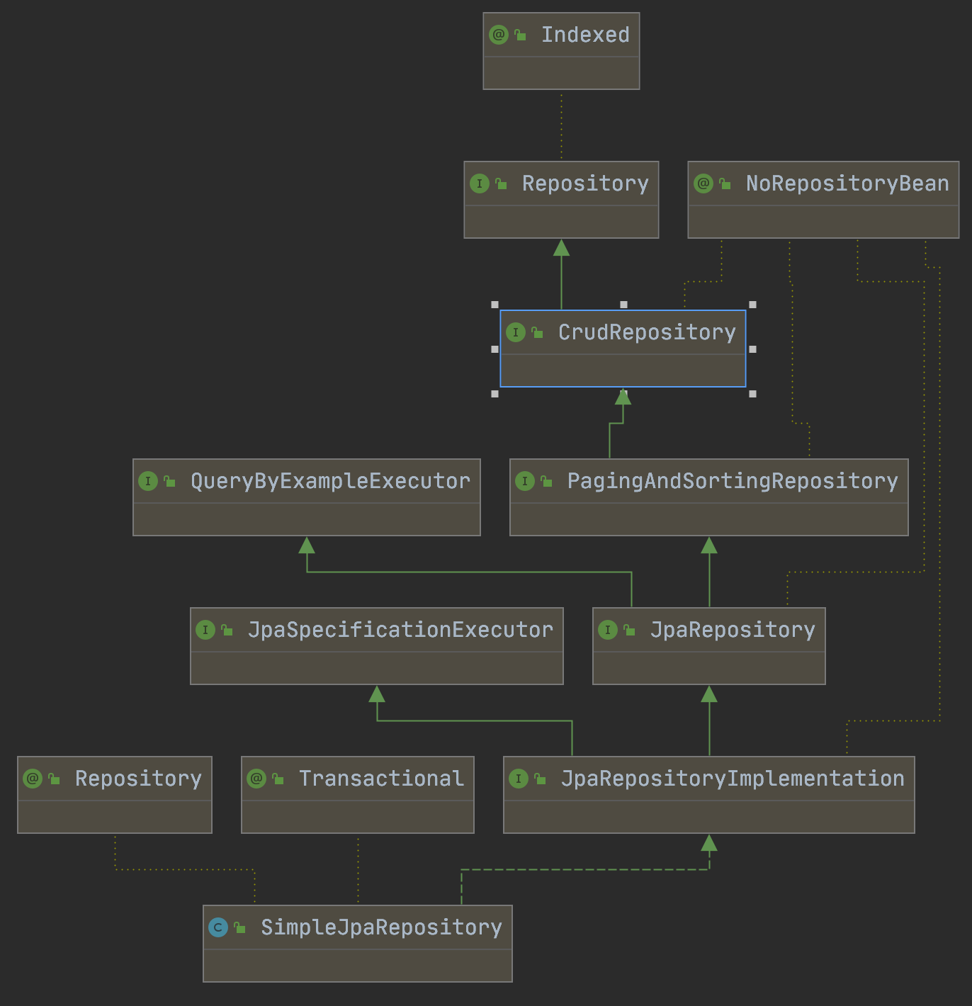 CrudRepository<T, ID> 는 인터페이스일 뿐이다. 실제 어떤 클래스가 인스턴스가 되는지는 디버깅을 해봐야 알 수 있었다.
