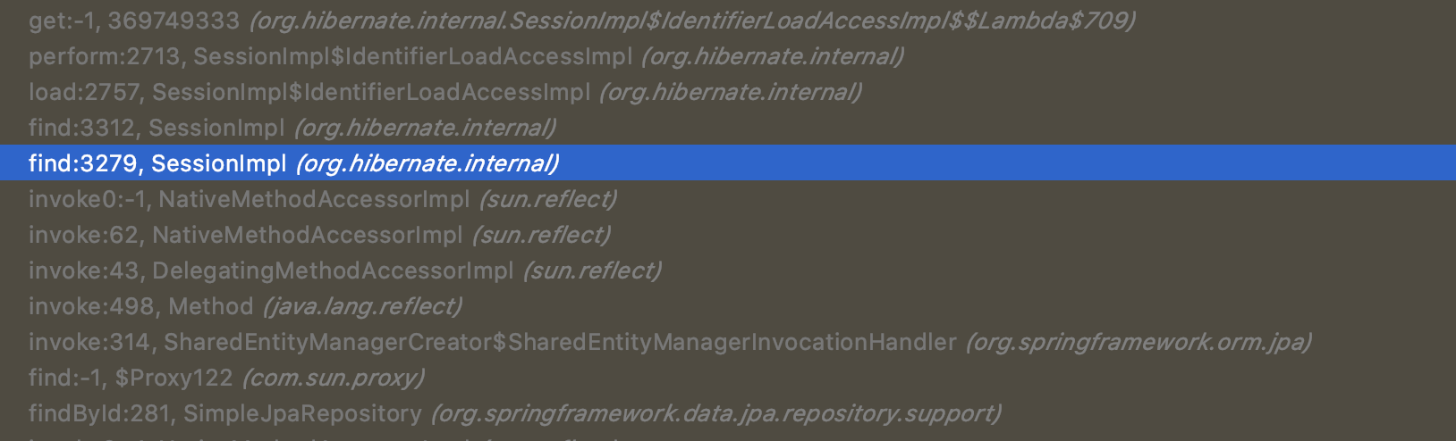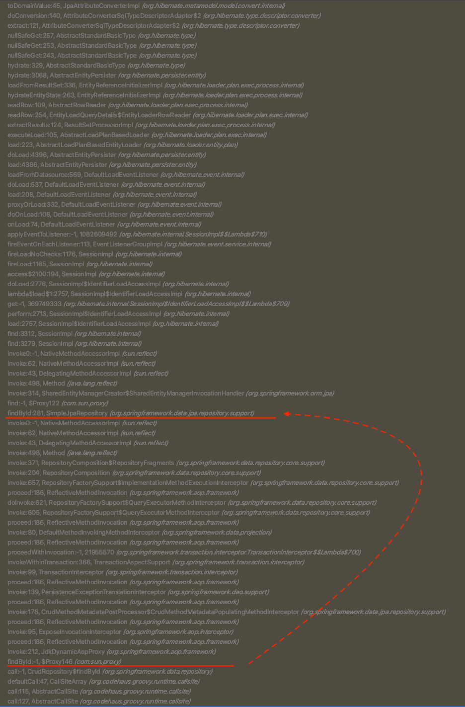 위의 호출 스택을 위로 올라가보면 JPA의 구현체로 하이버네이트가 사용되었음을 알 수 있다.