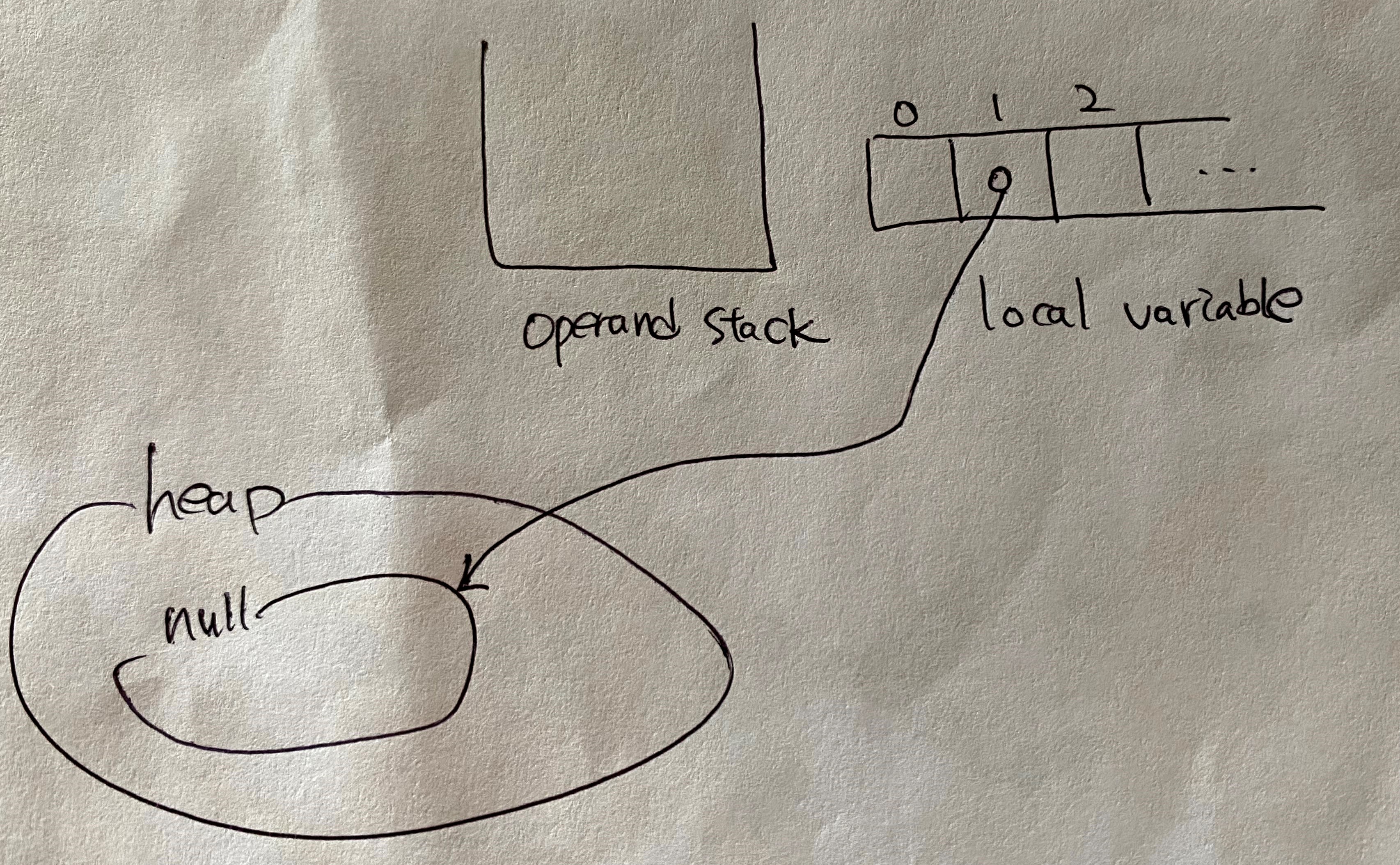이후 ASTORE_1 명령에 의해 operand stack의 레퍼런스는 지역변수에 들어가게 된다.